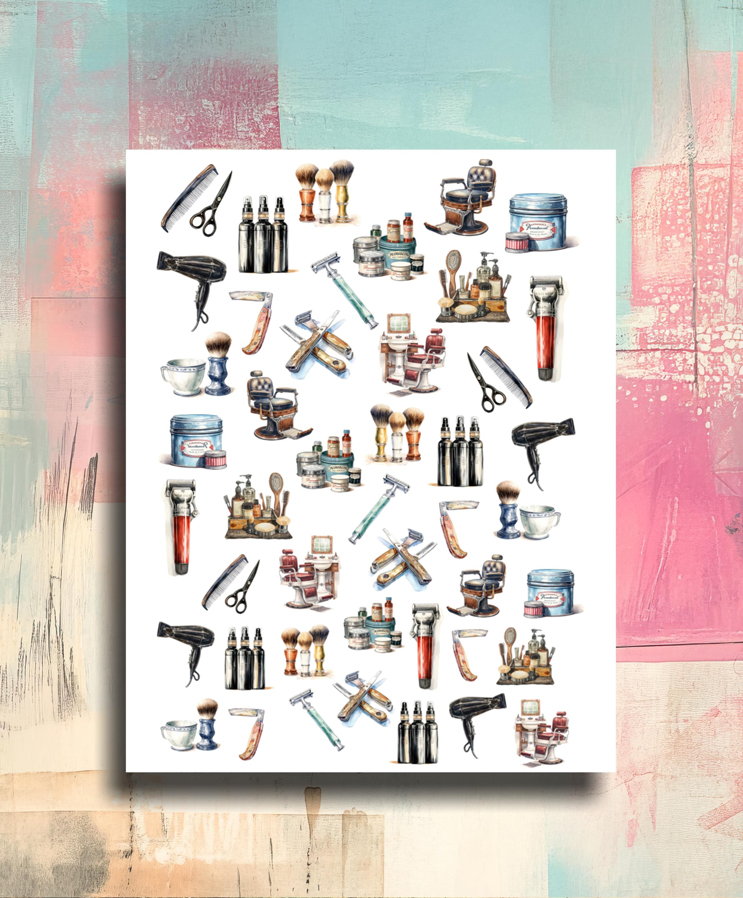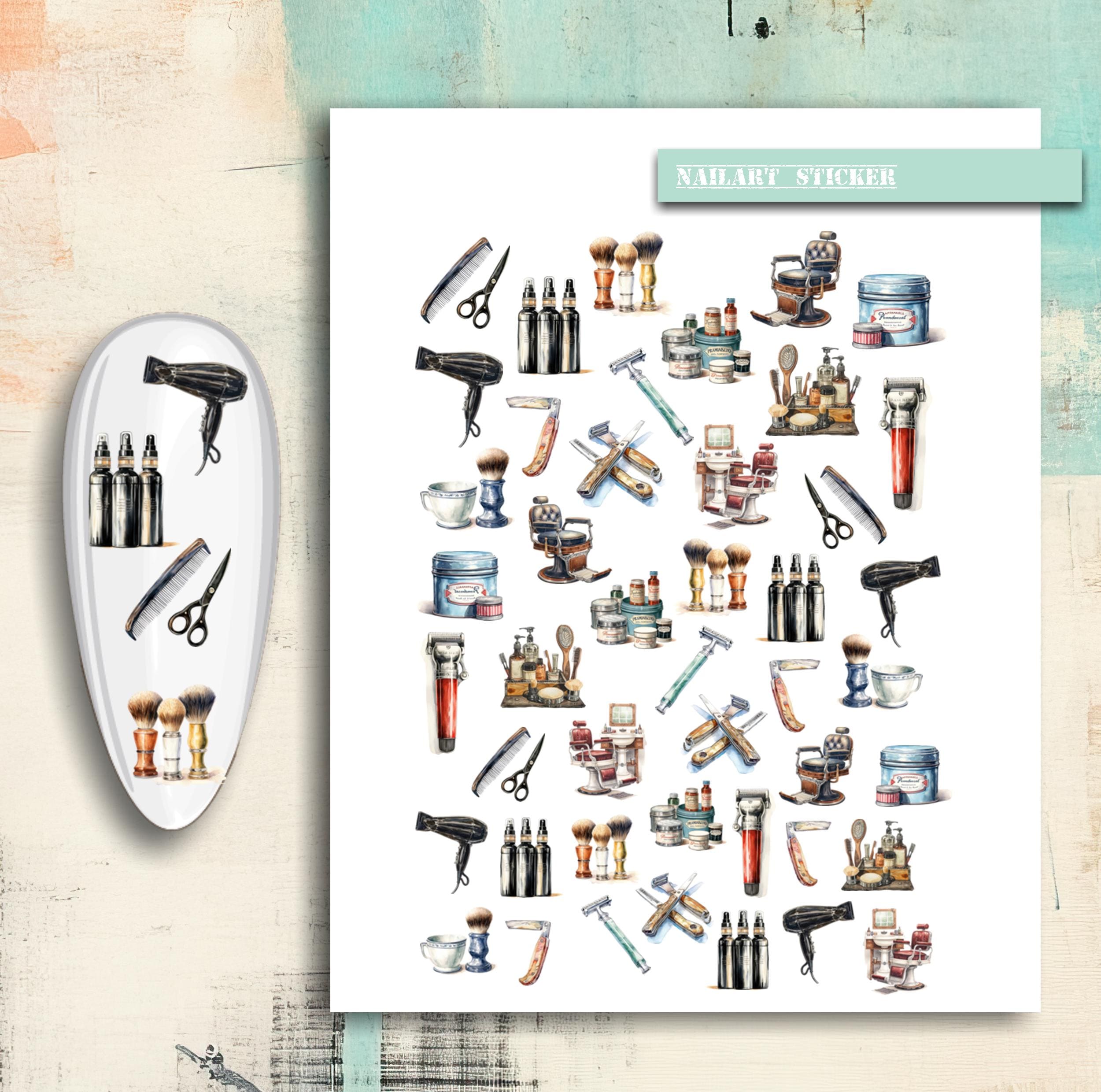 Nail Stickers / Barber Supplies / Retro Hair Dryer, Scissors, Razor, Shaving Brush / Nail Art