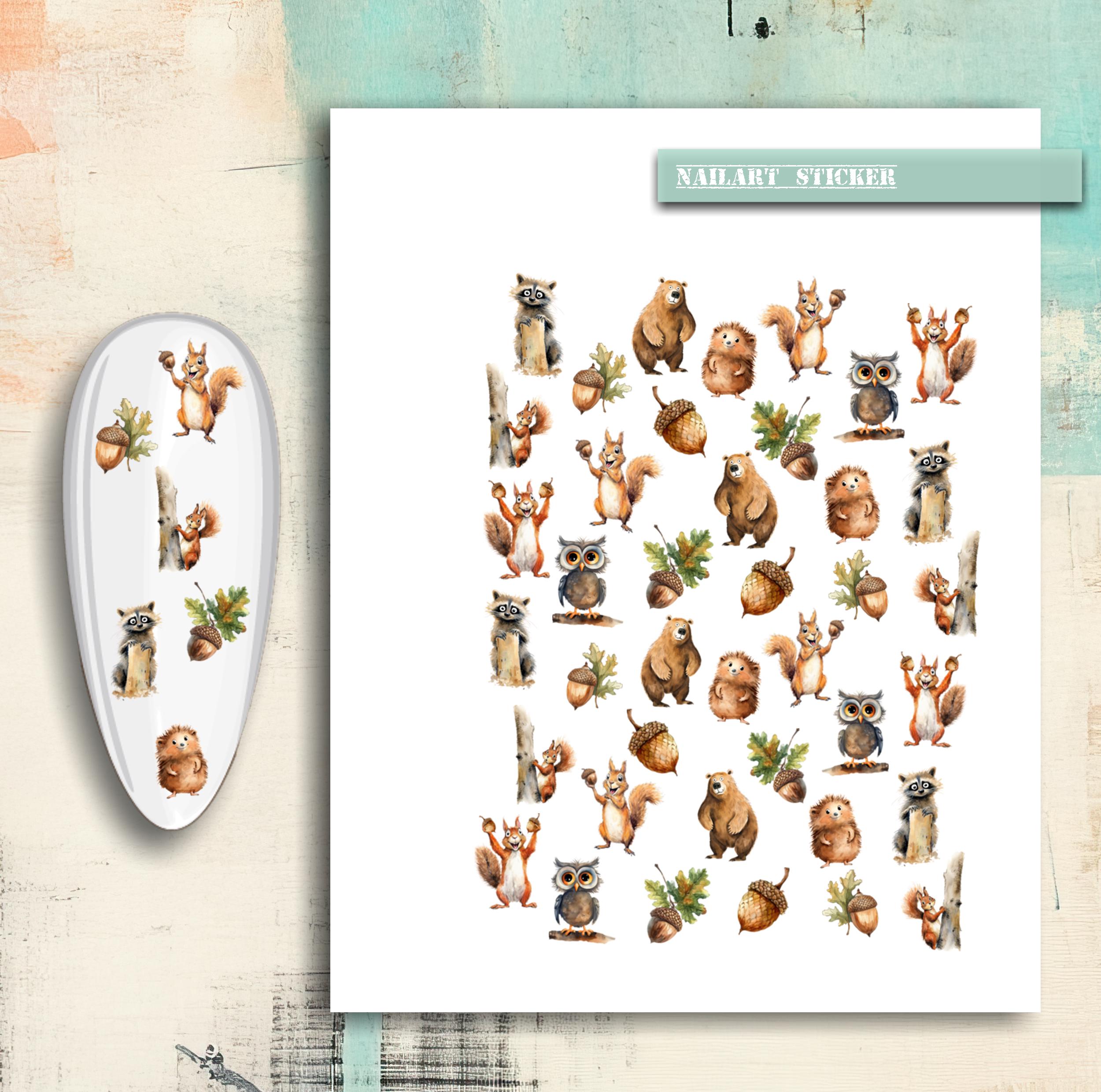 Nail stickers, nail tattoo nail art, autumn, brown bear, squirrel, hedgehog, owl, nail art sticker nature, forest