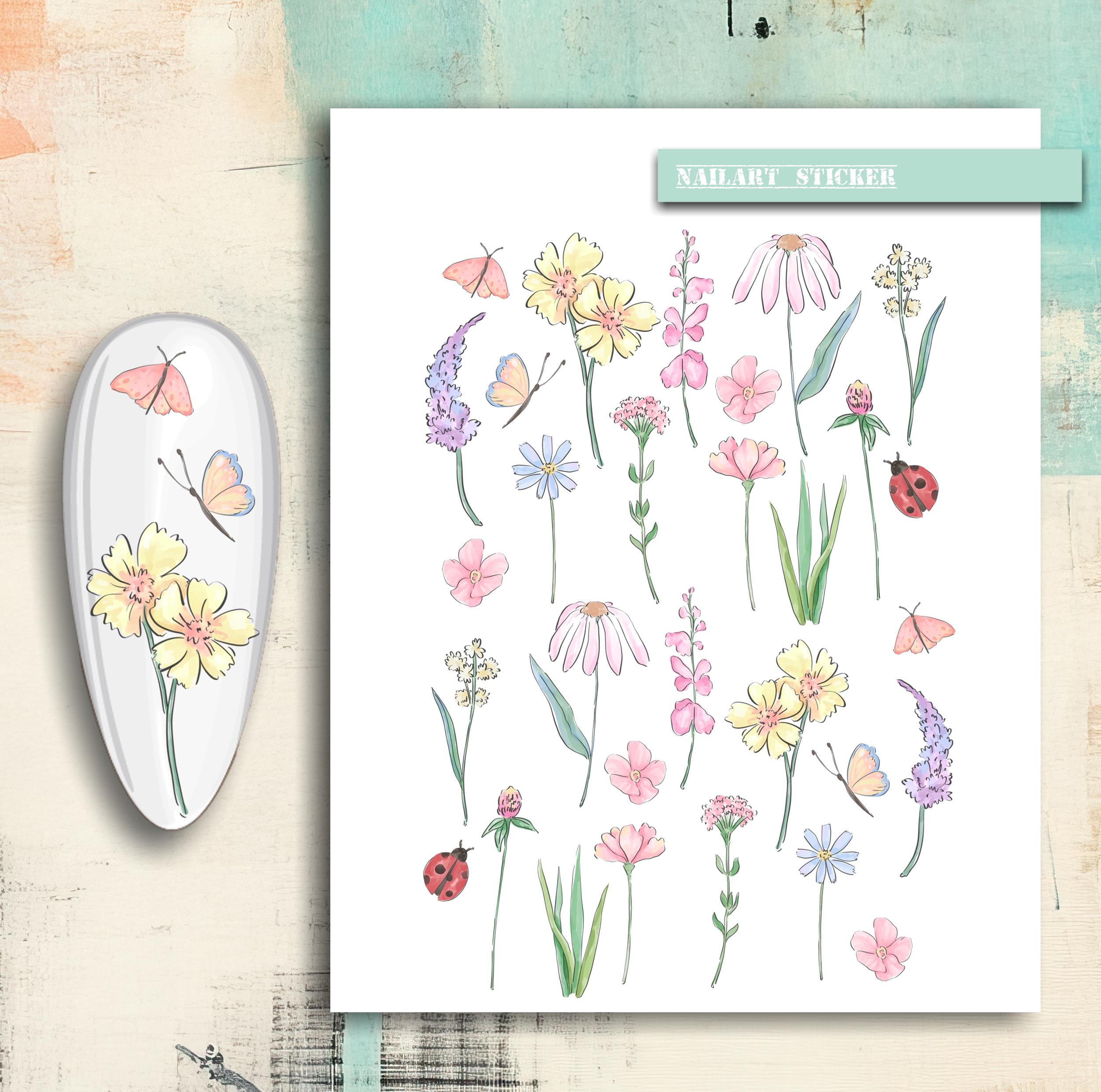 Nail Stickers, Nail Art Meadow Flower - Nail Stickers, Nail Art - Waterslide Decals - Butterfly, Ladybug, Wildflowers