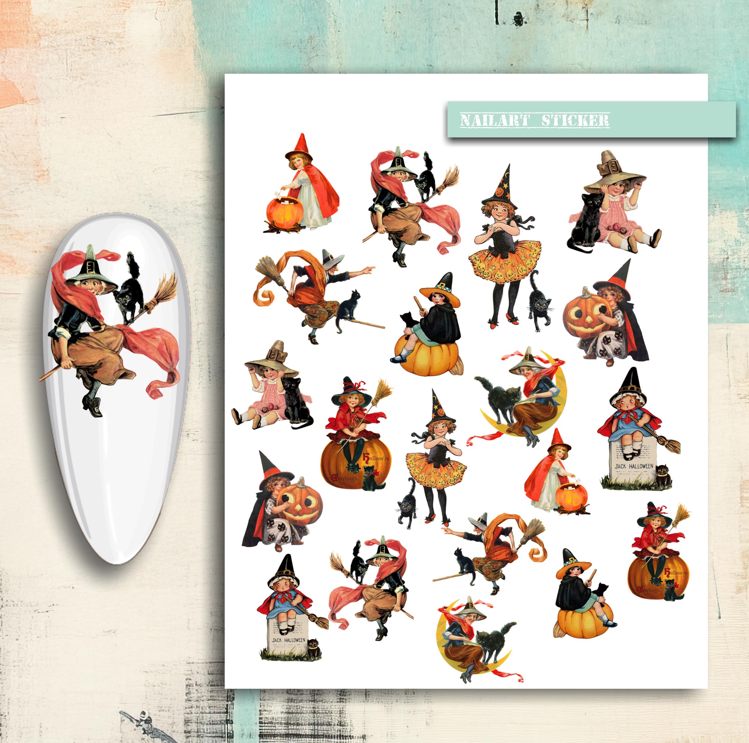 Halloween nail art, vintage nail stickers: pumpkin, cat, broomstick, owl, Halloween for kids, witch