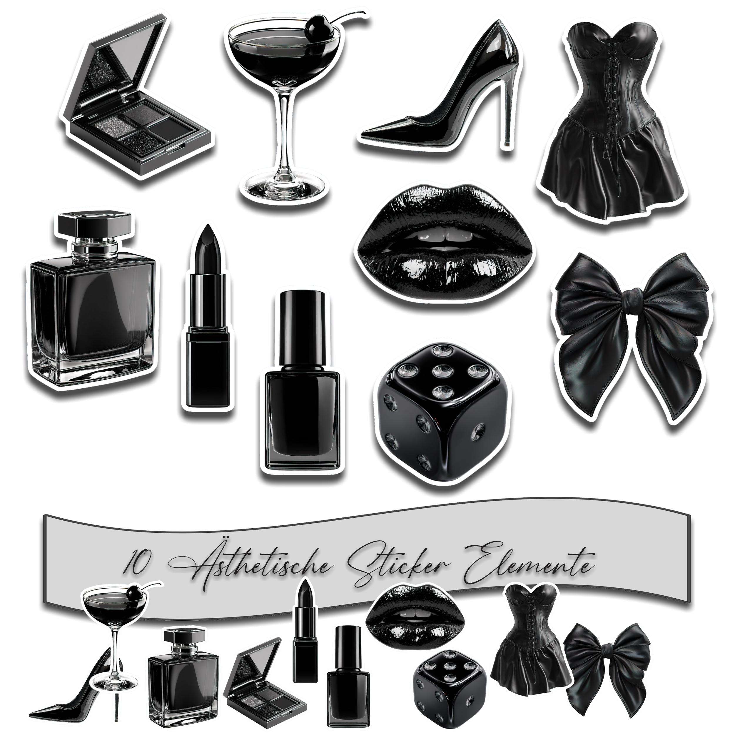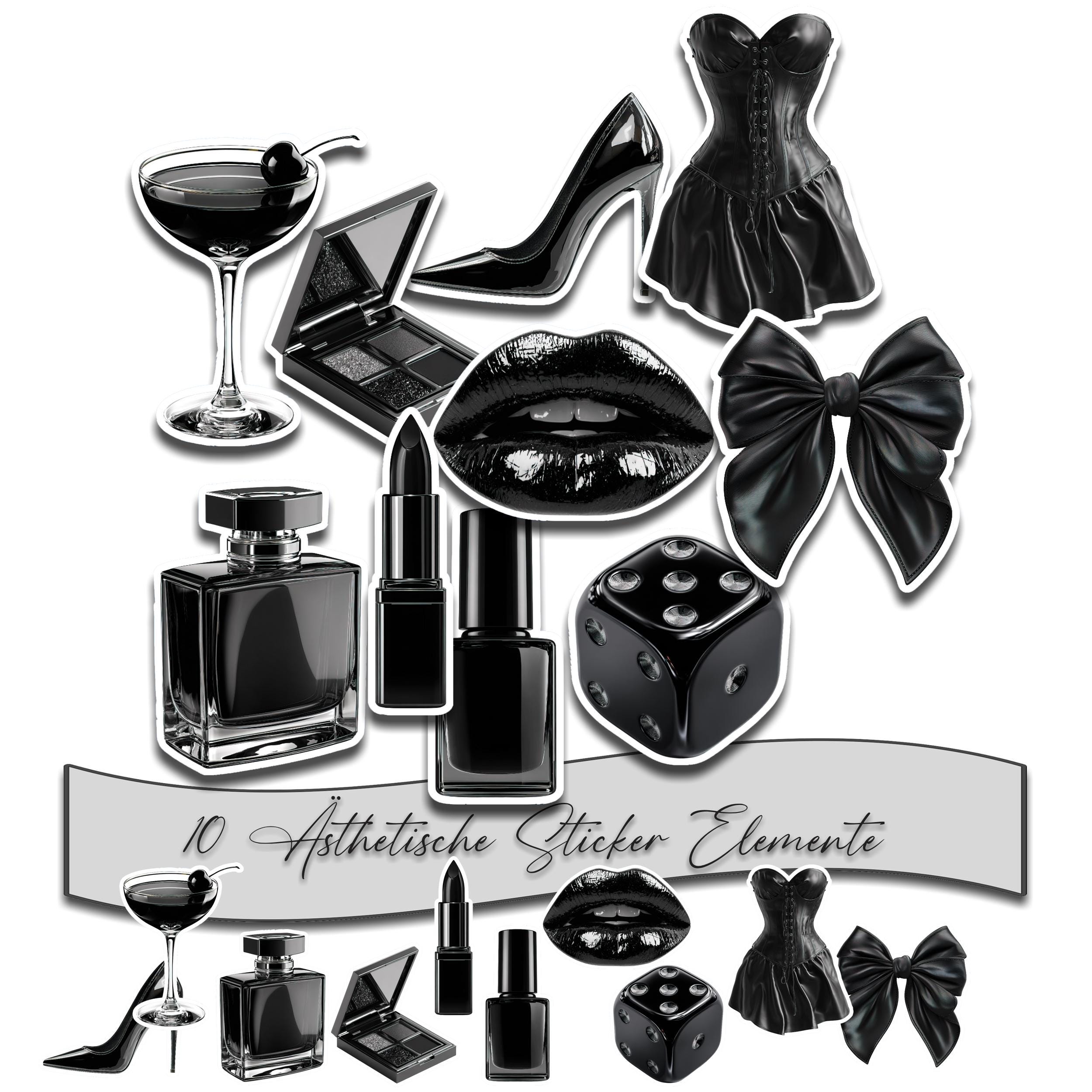 ( Cocktail, Makeup, High Heels, Dress, Mouth, Bow, Perfume, Lipstick, Nail Polish, Dice, Black )