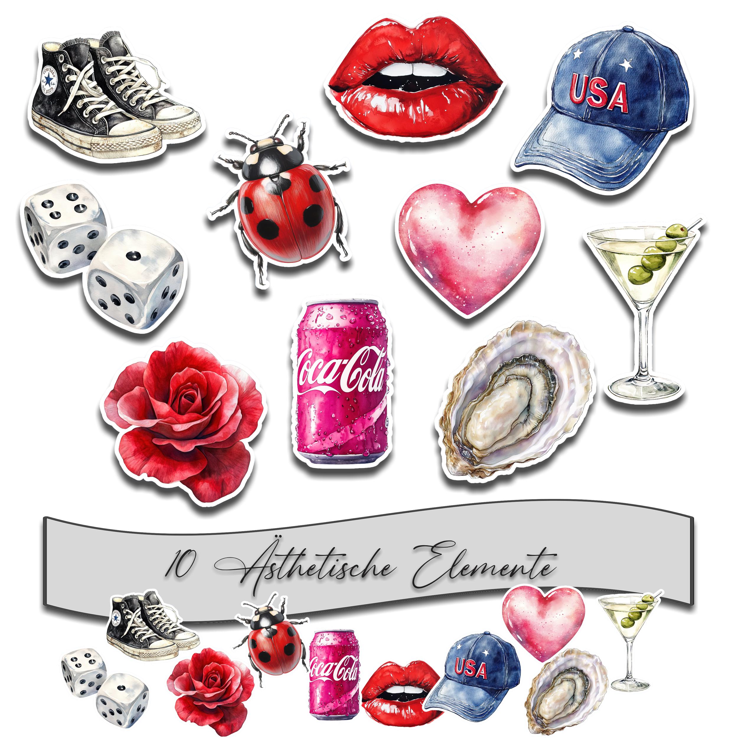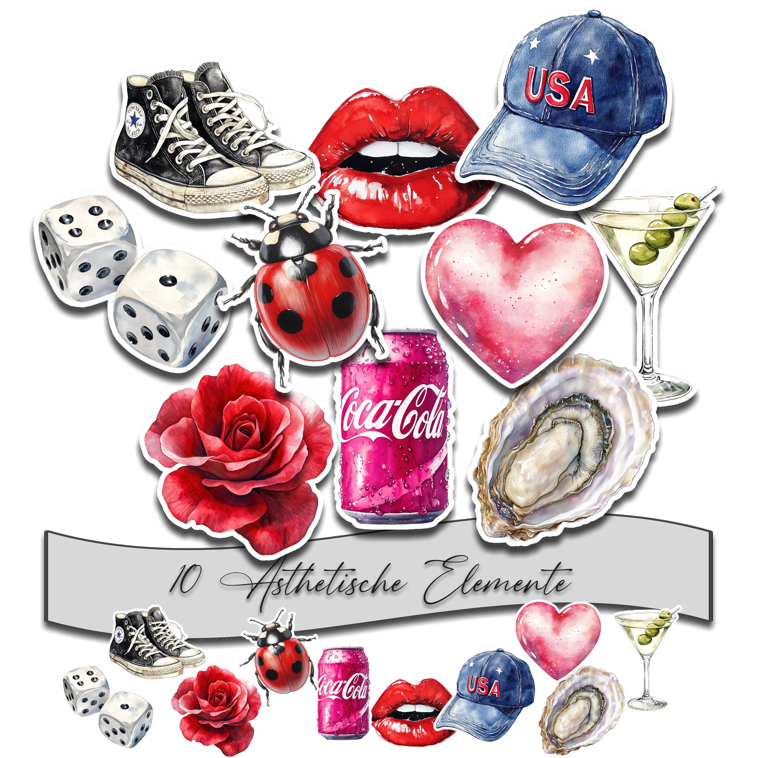 ( Dice, Sneaker, Mouth, Baseball Cap, Heart, Ladybug, Cocktail, Rose, Coke Can, Shell )