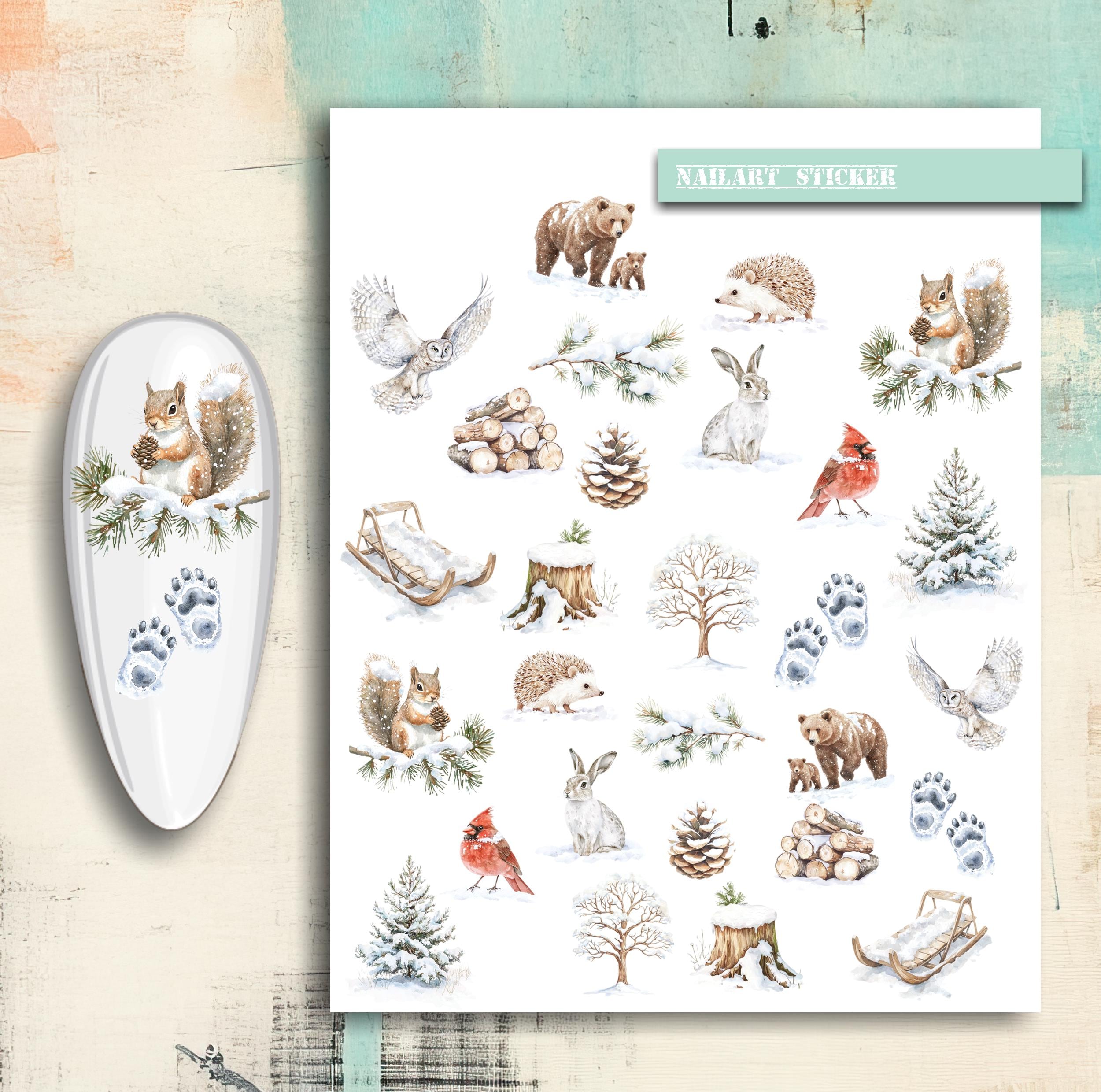 Nail stickers, nail tattoo nail art, winter, brown bear, squirrel, hedgehog, owl, nail art stickers nature, trees, fox