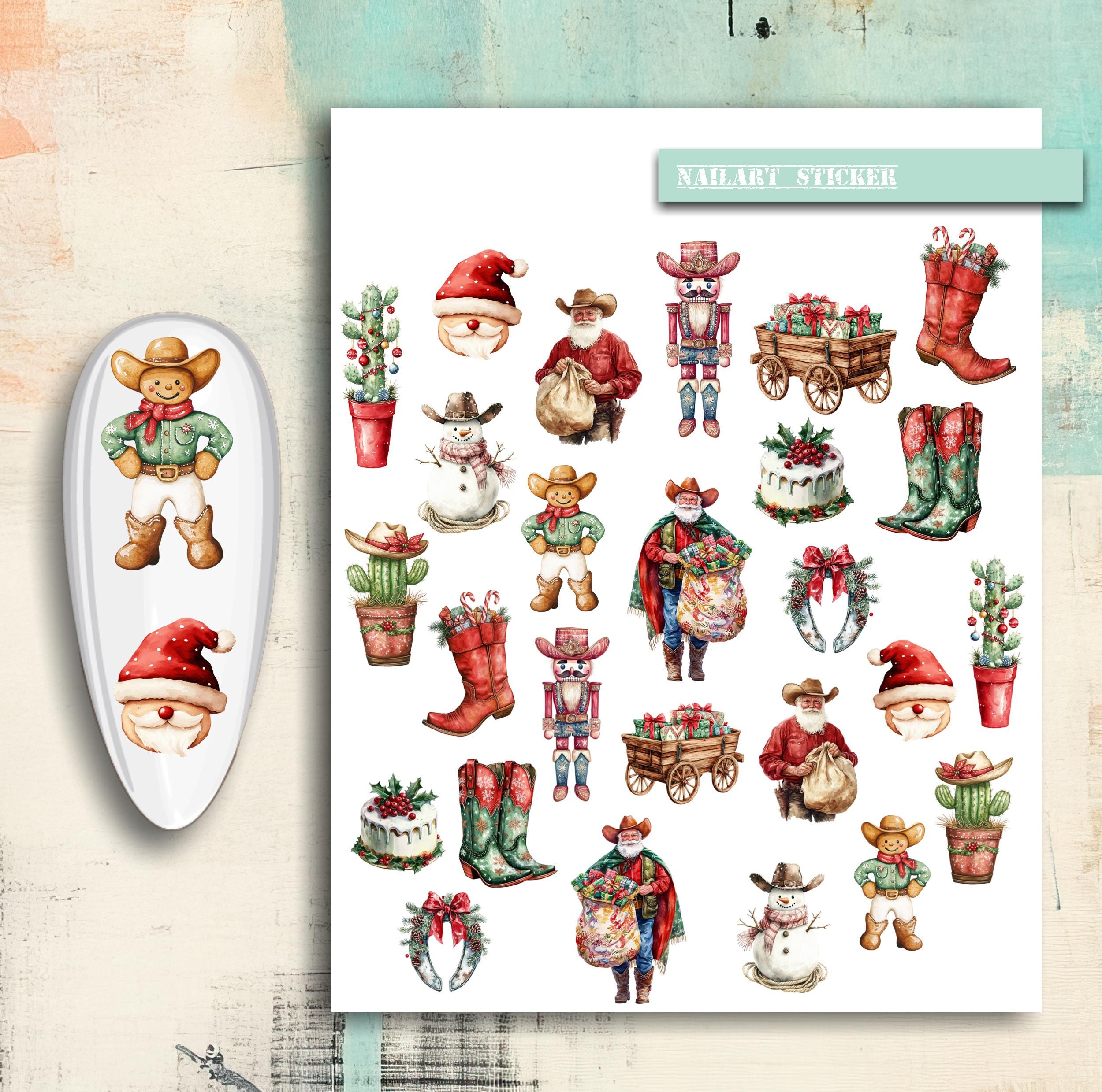 Cowboy Christmas Nail Stickers / Water Nail Decals / Rancher Nail Art / Cowboy Boots, Snowman with Cowboy Hat