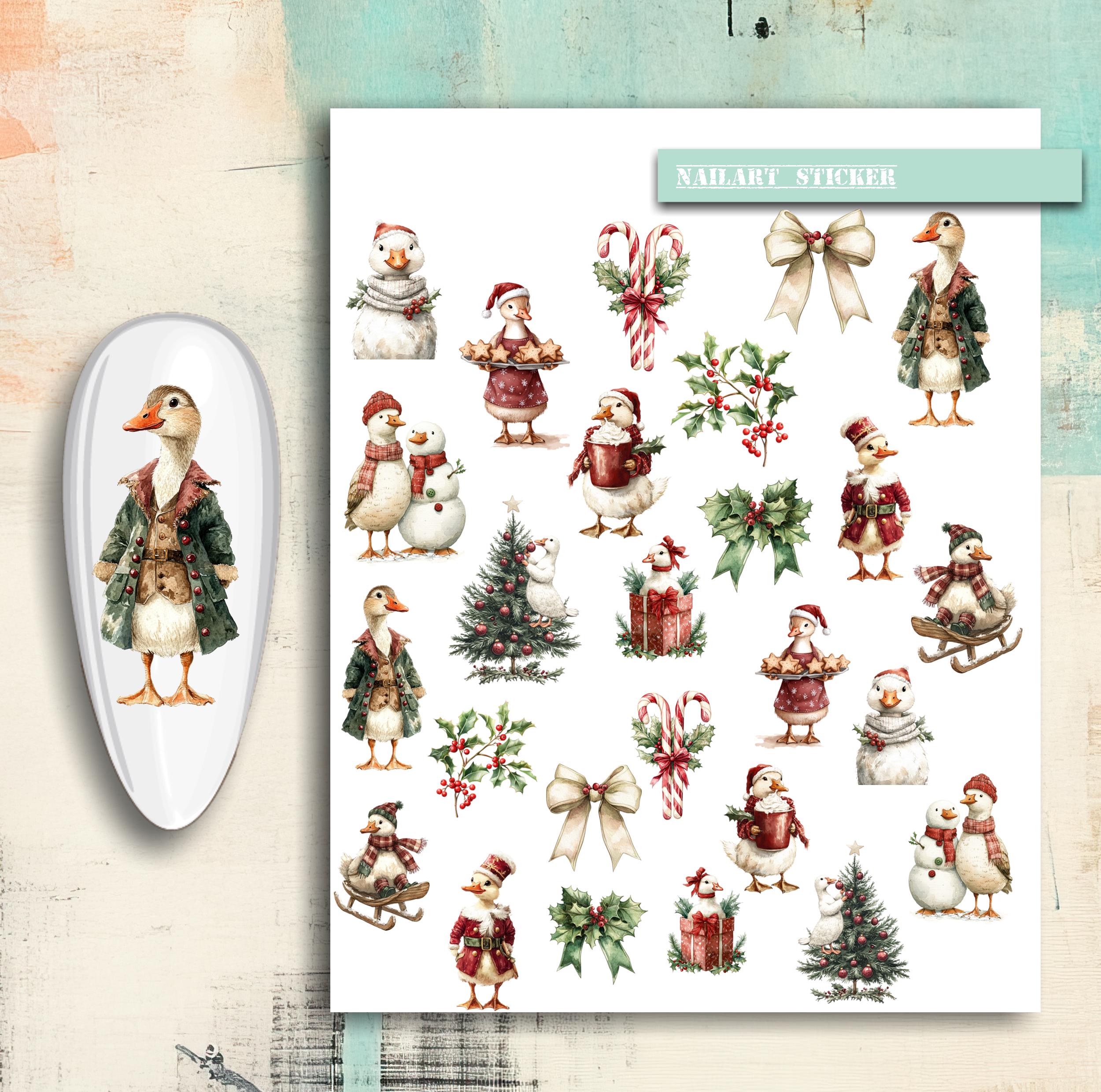 Christmas Goose Nail Stickers / Water Nail Decals / Silly Goose Rustic Red Green Winter Watercolor