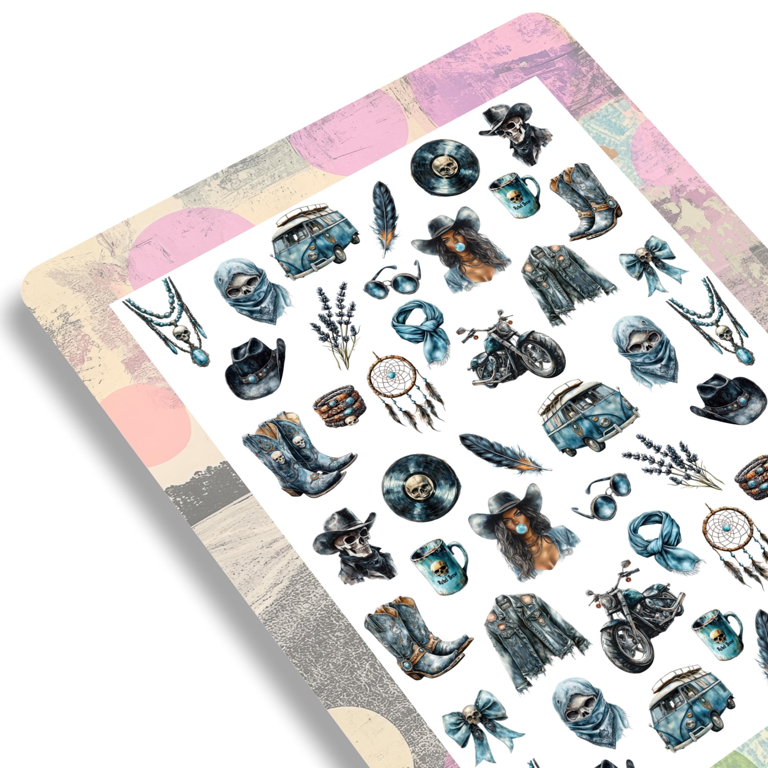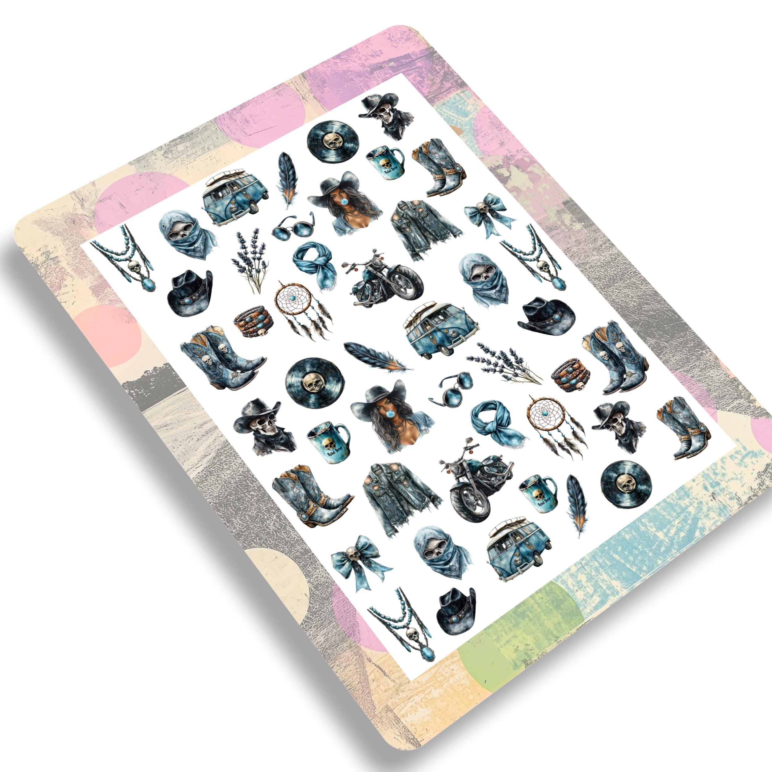 Cowgirl Western Skull Nail Sticker - Waterslide Nail Decal, Skull, Dream Catcher, Chopper, Cowboy Boots Nail Art Denim Blue Blue
