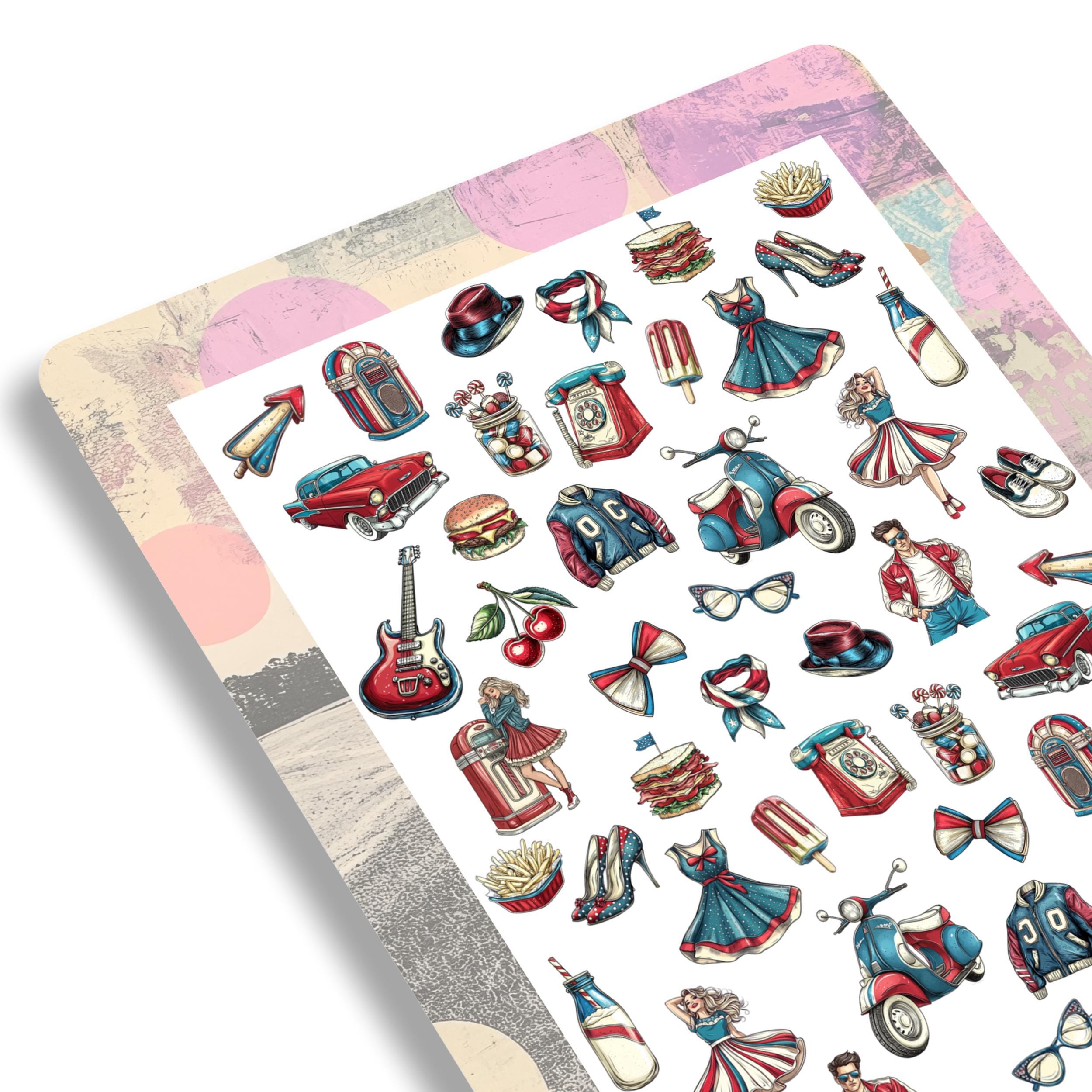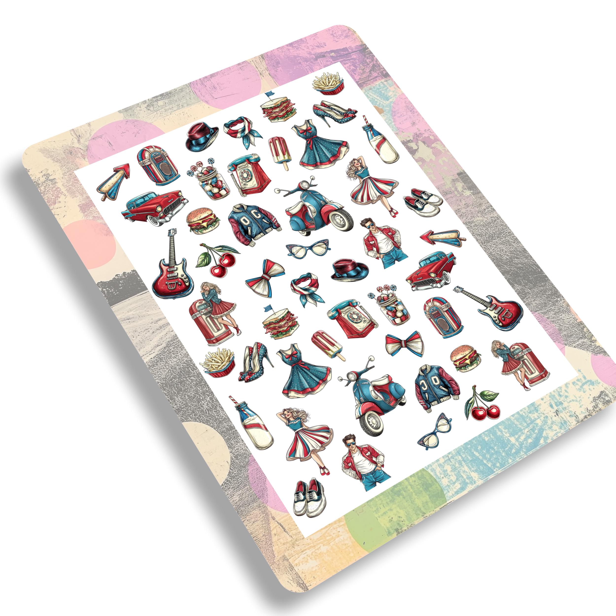 Vintage Diner Sock Hop Party Nail Stickers - Waterslide Nail Decals - Nail Art Retro Jukebox, Milkshake