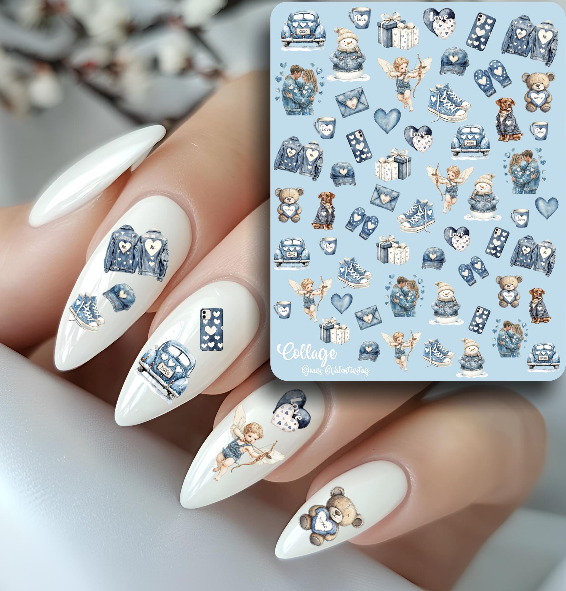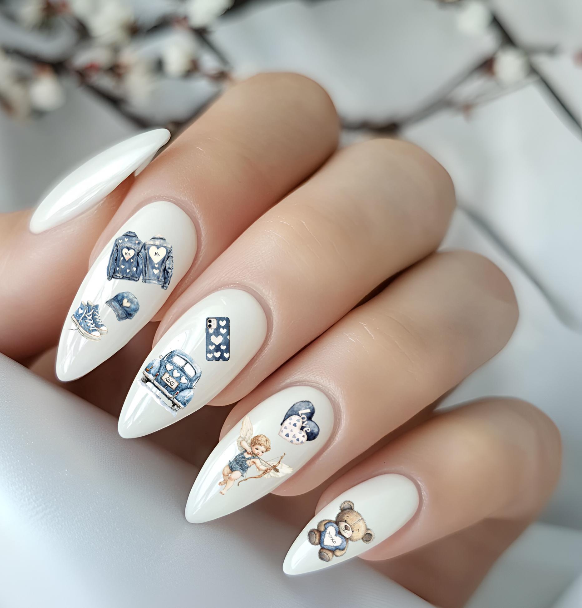 Valentine's Day nail art, nails, love, denim, romantic fingernails, waterslide foil nail design, affection