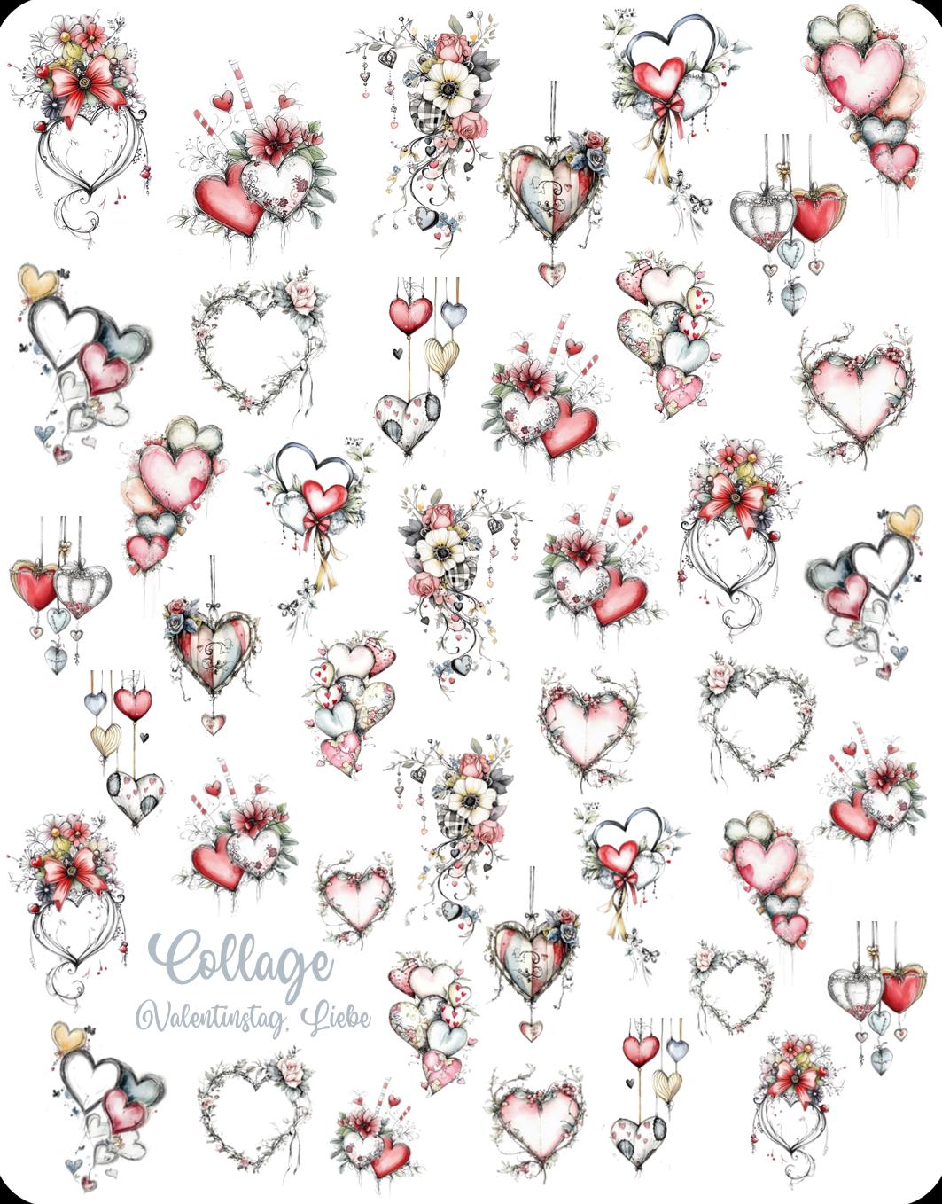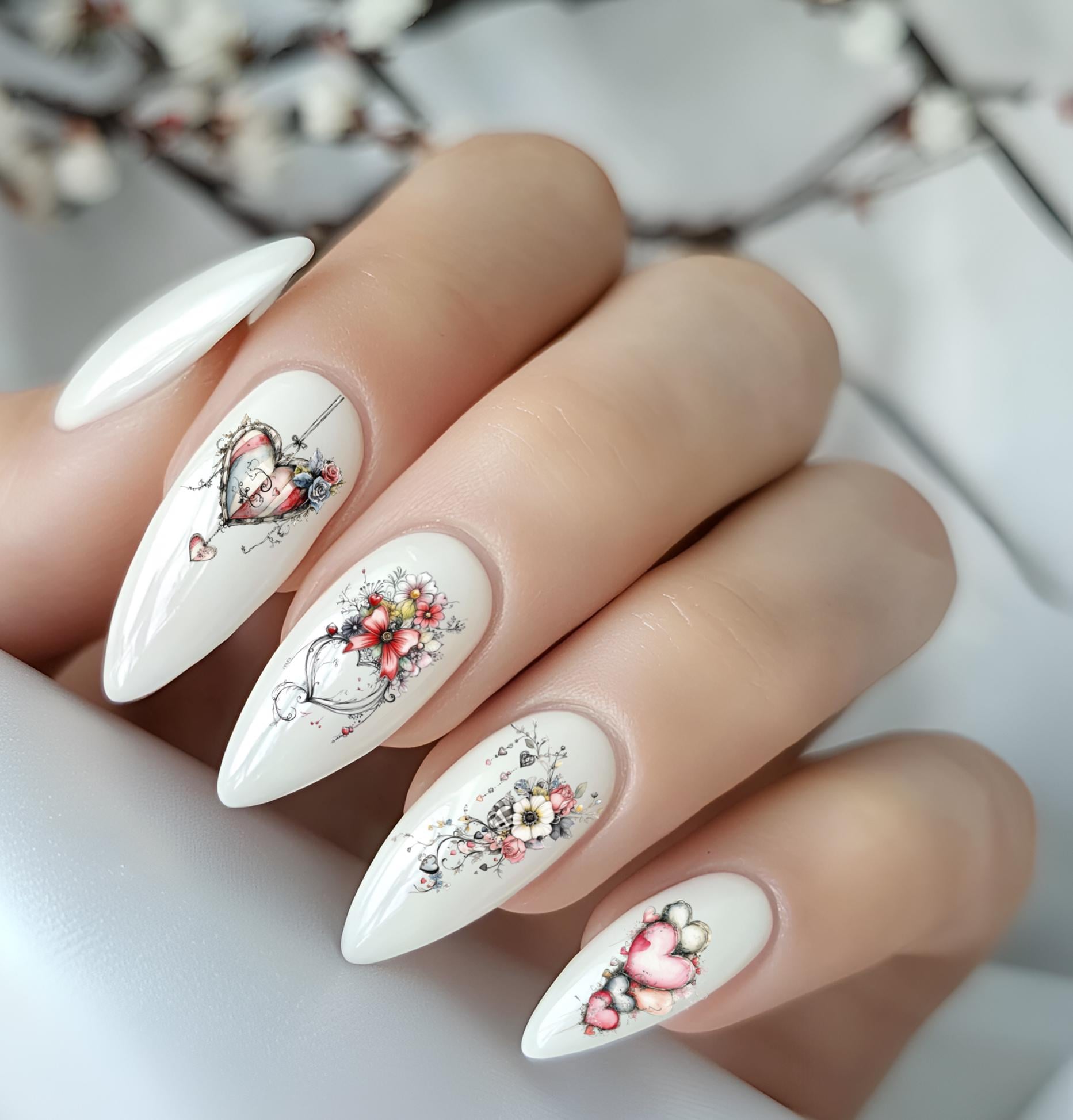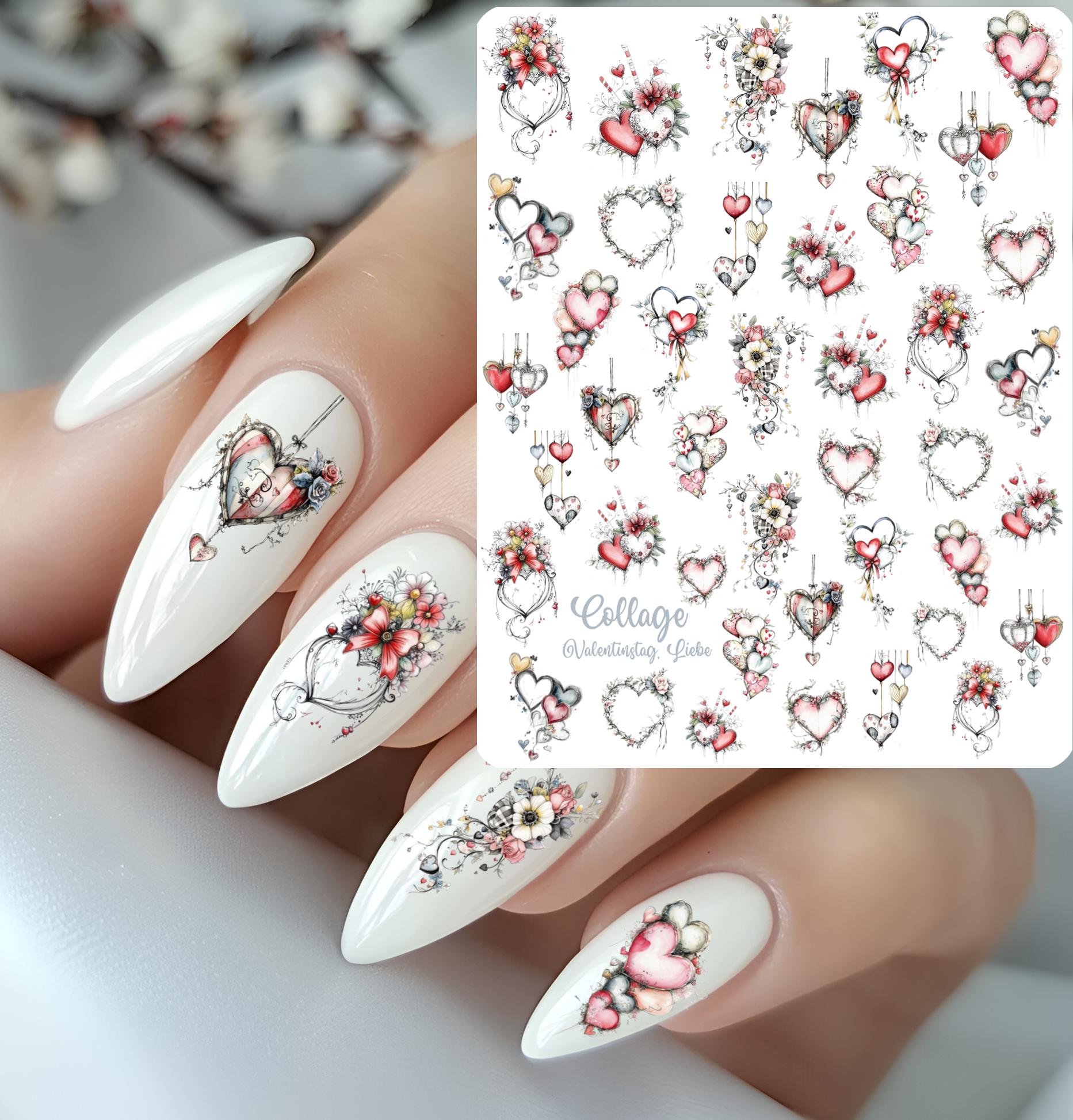 Valentine's Day nail art, nails, love, hearts, flower, romantic fingernails, waterslide foil nail design, affection