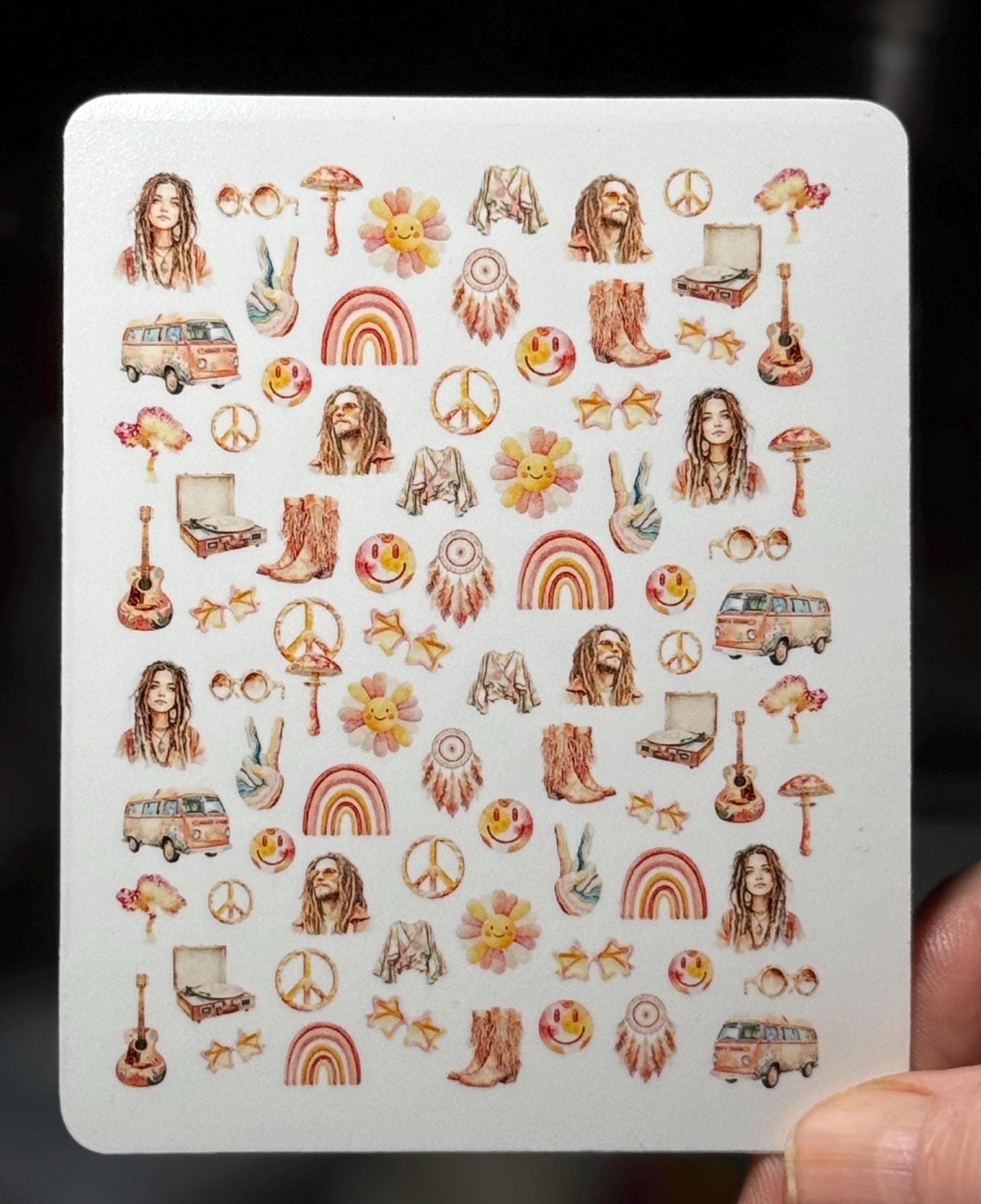 2D Boho Hippie Water Slide Nail Stickers, 70s Retro Nail Art Stickers