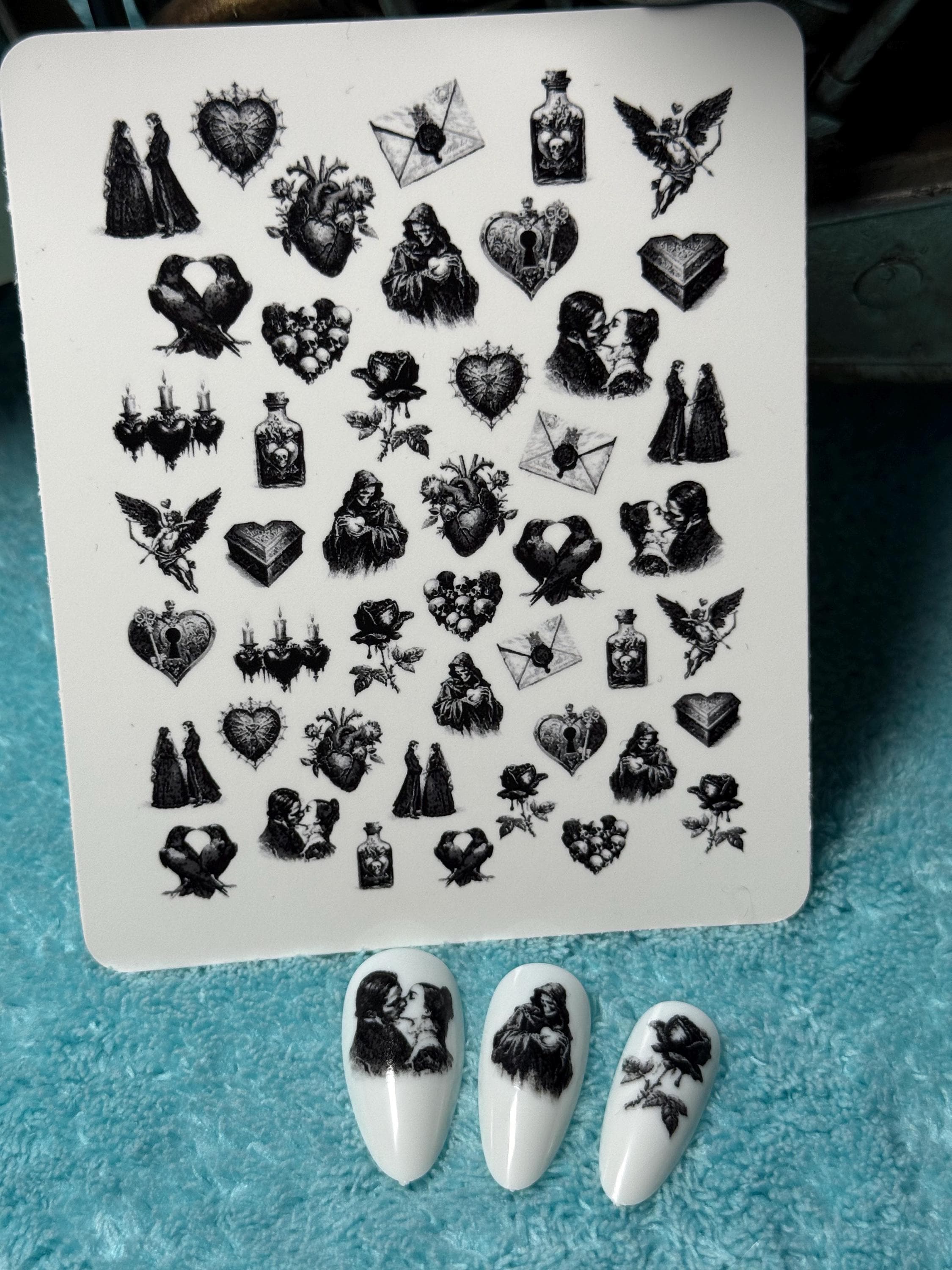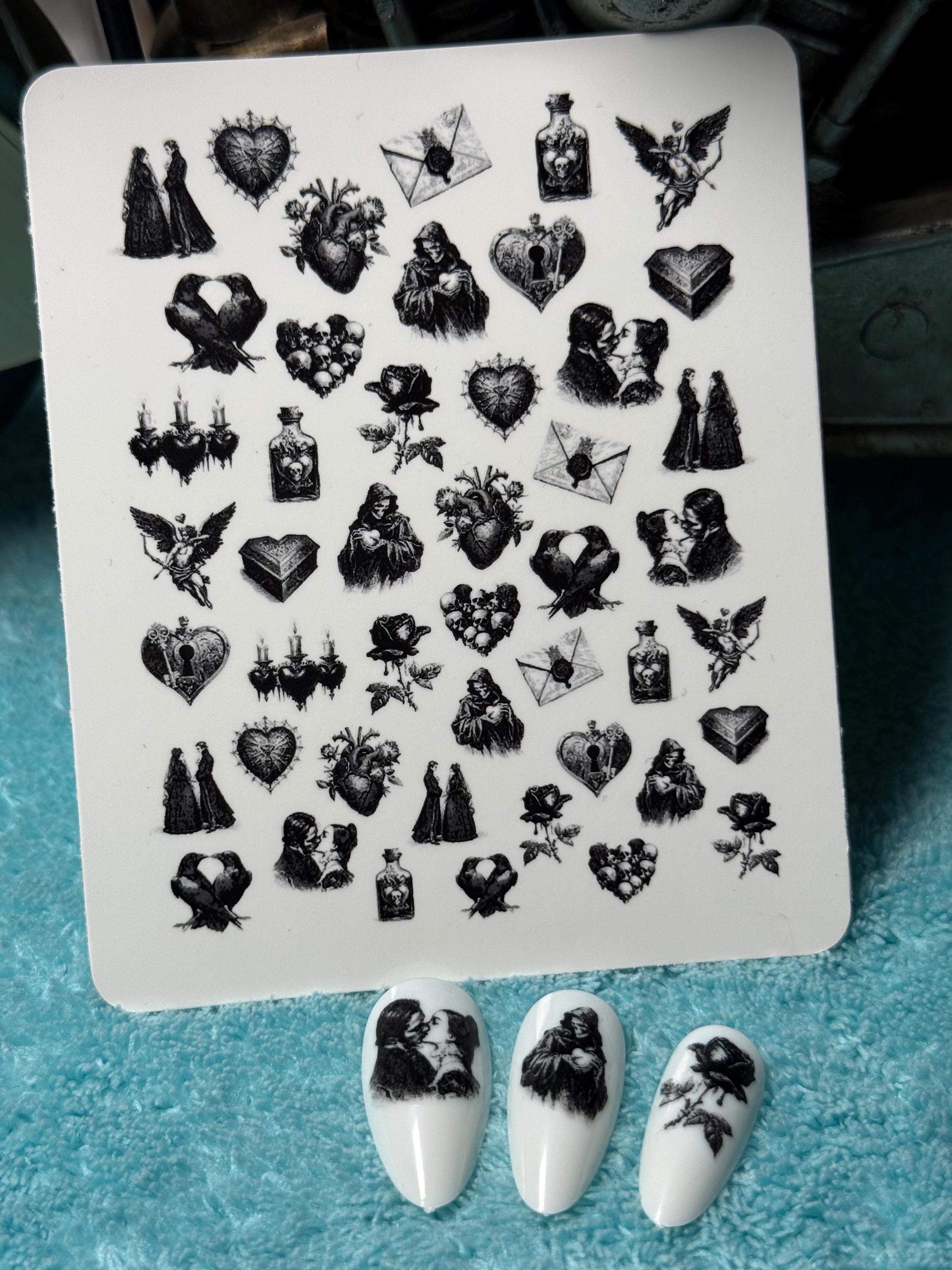 Dark Love Water Nail Stickers, Water Slide Stickers for Nails, Gothic Valentine's Day Nail Art Stickers, Old School