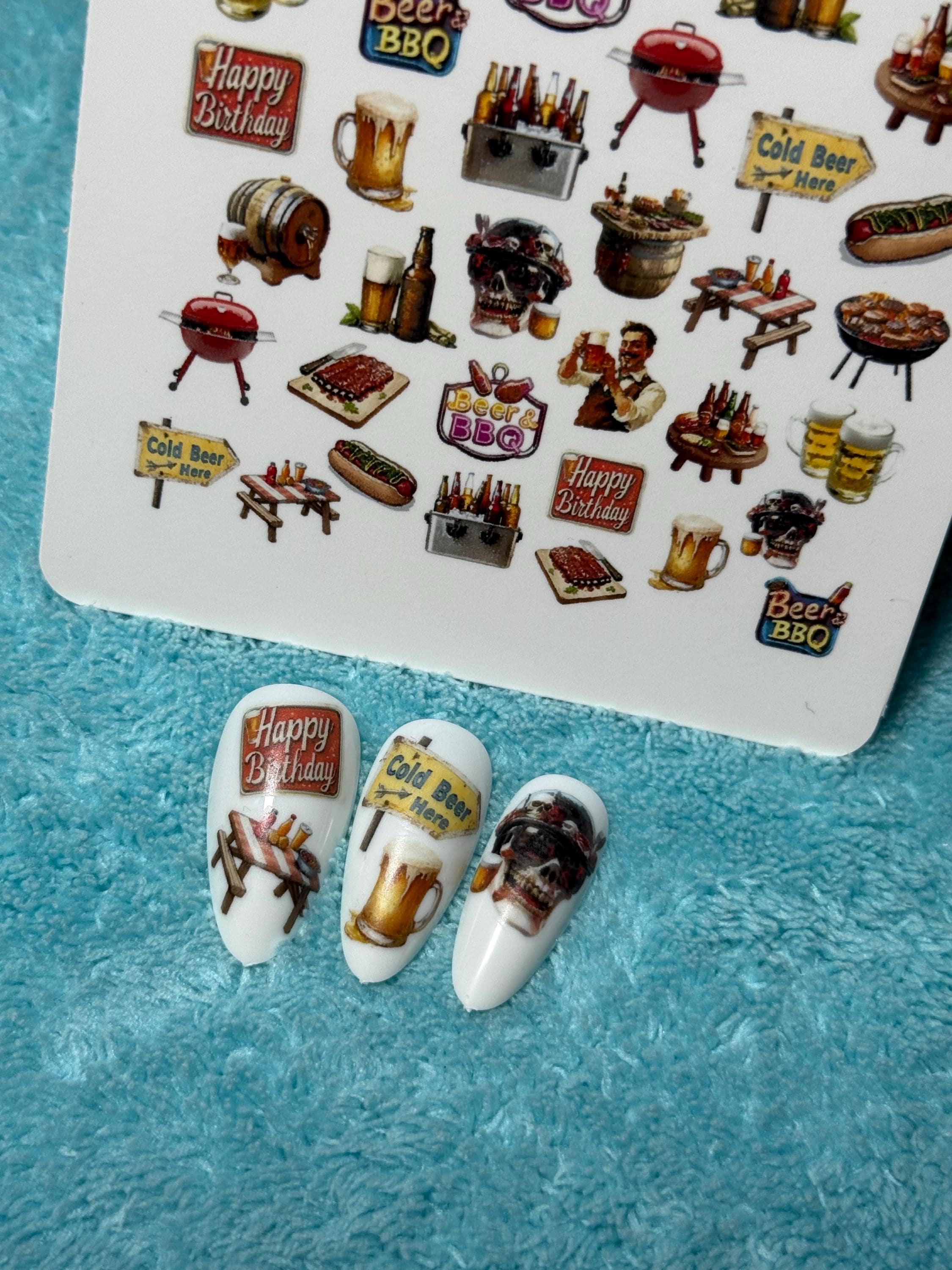 Barbecue, birthday party, water-based nail stickers, beer-themed stickers, nail art, barbecue, party, celebrations