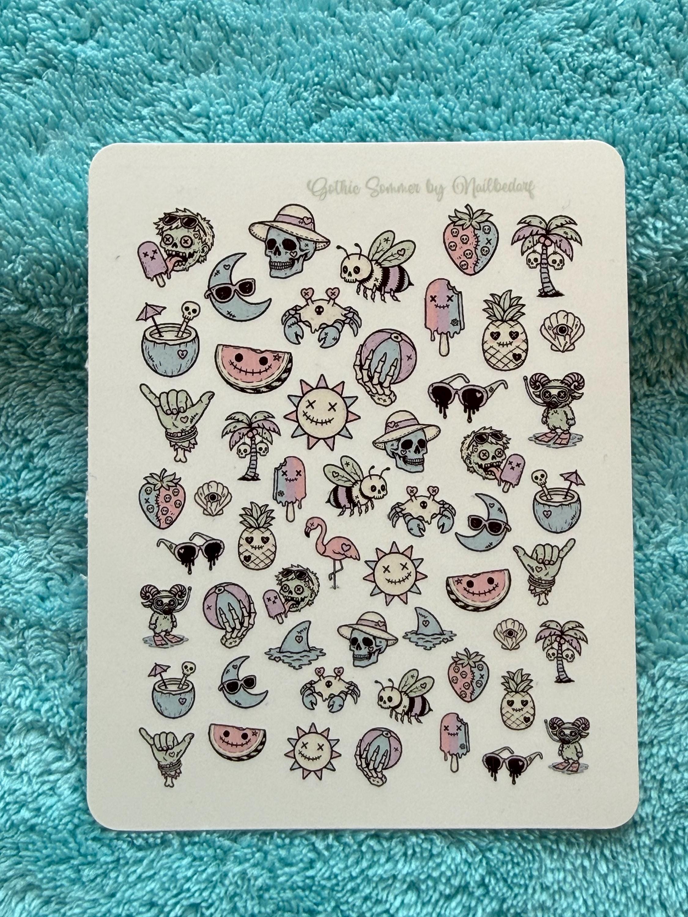 NEW Cute pastel gothic summer waterslide stickers for nails, nail art nail stickers, creepy seashell, beach Krampus