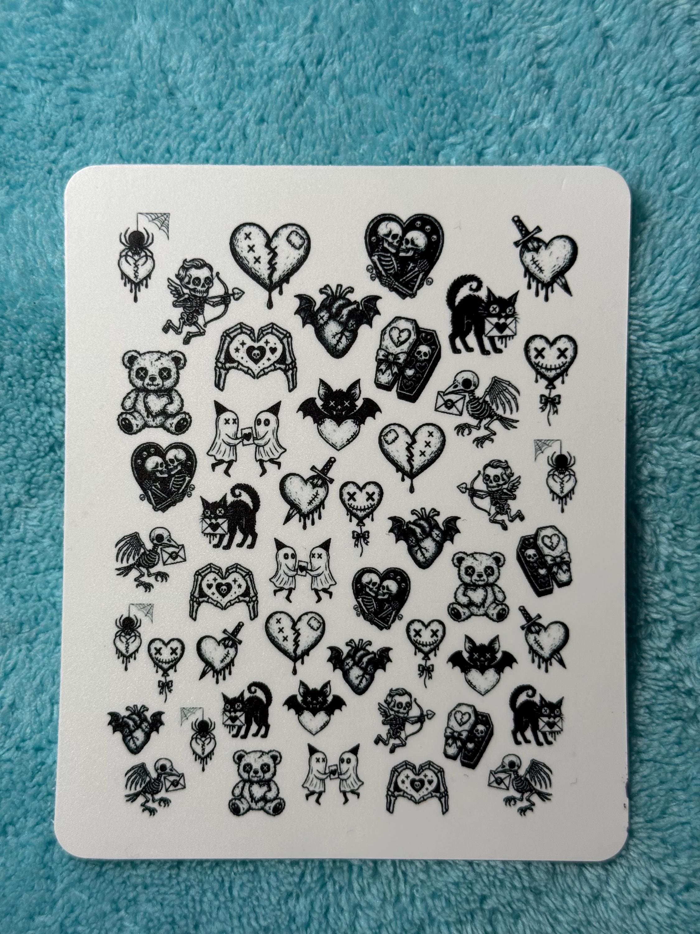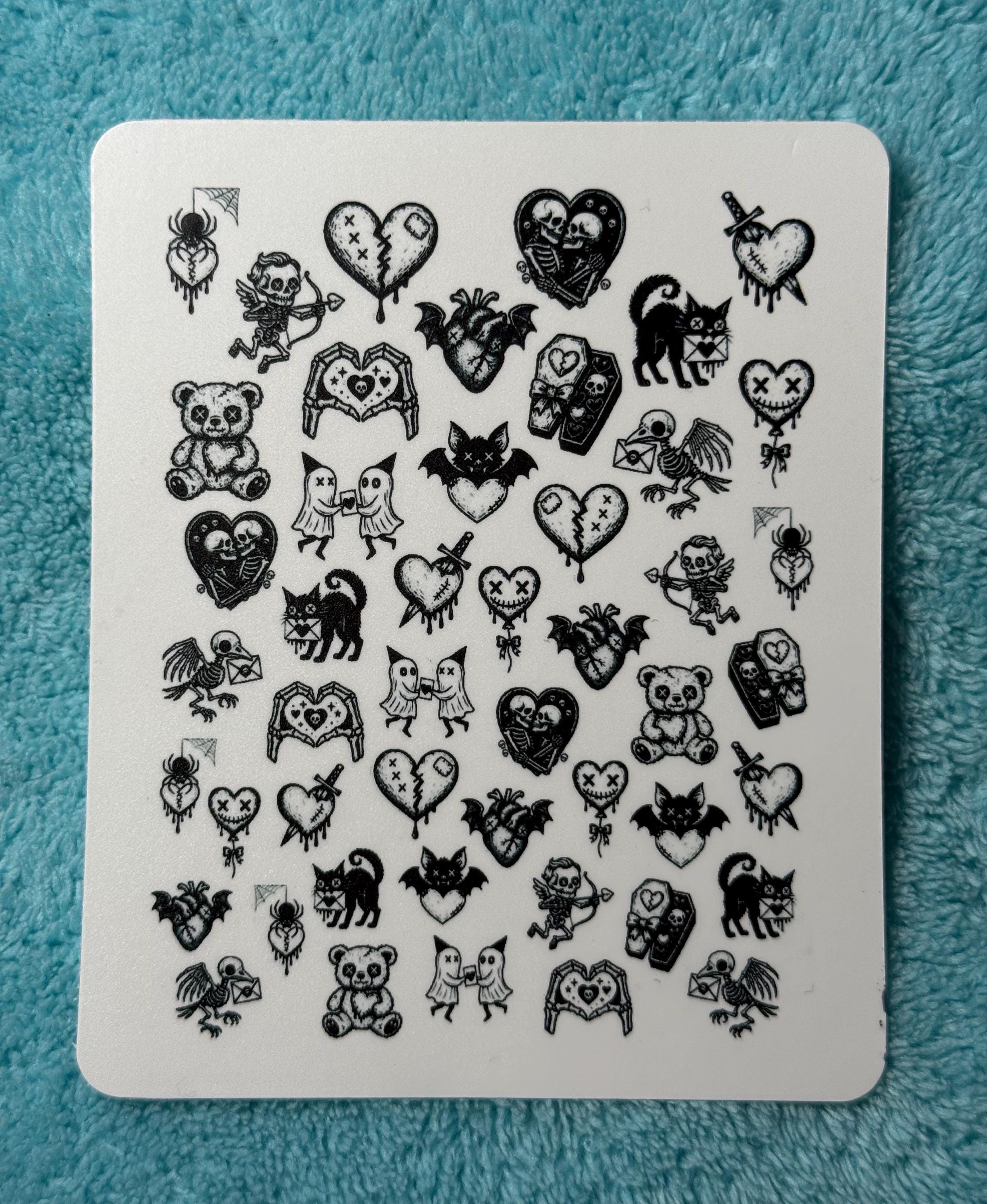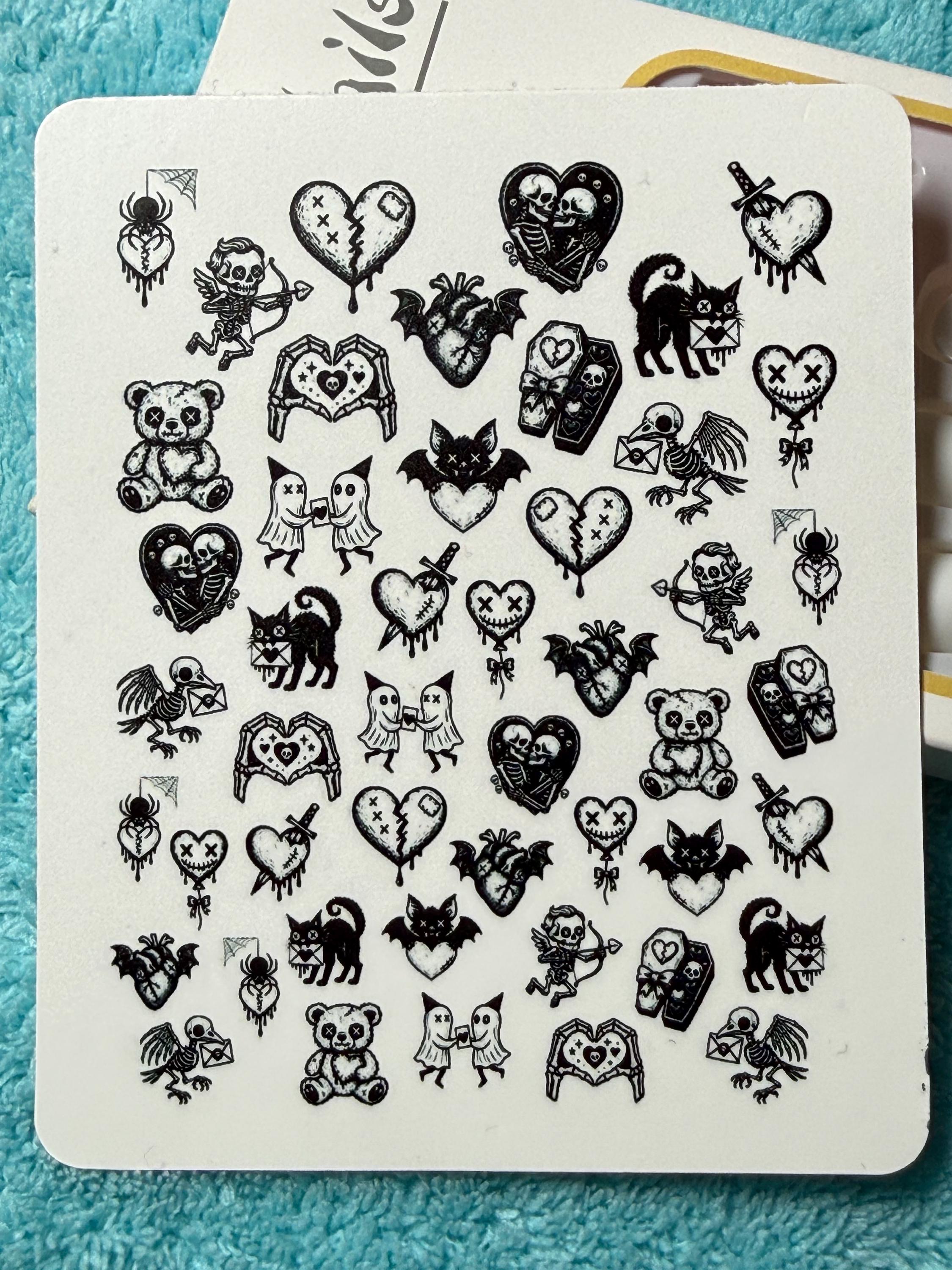 Pastel Gothic Nail Art Water Slide Stickers for Nails, Black and White Nail Stickers, Spooky Valentine's Day Ghost, Skeleton, Black Cat