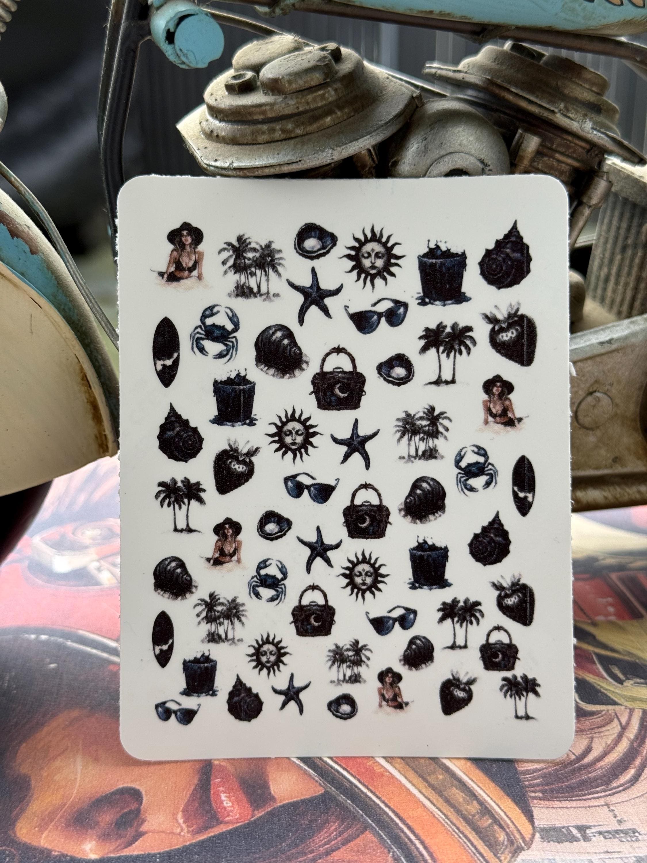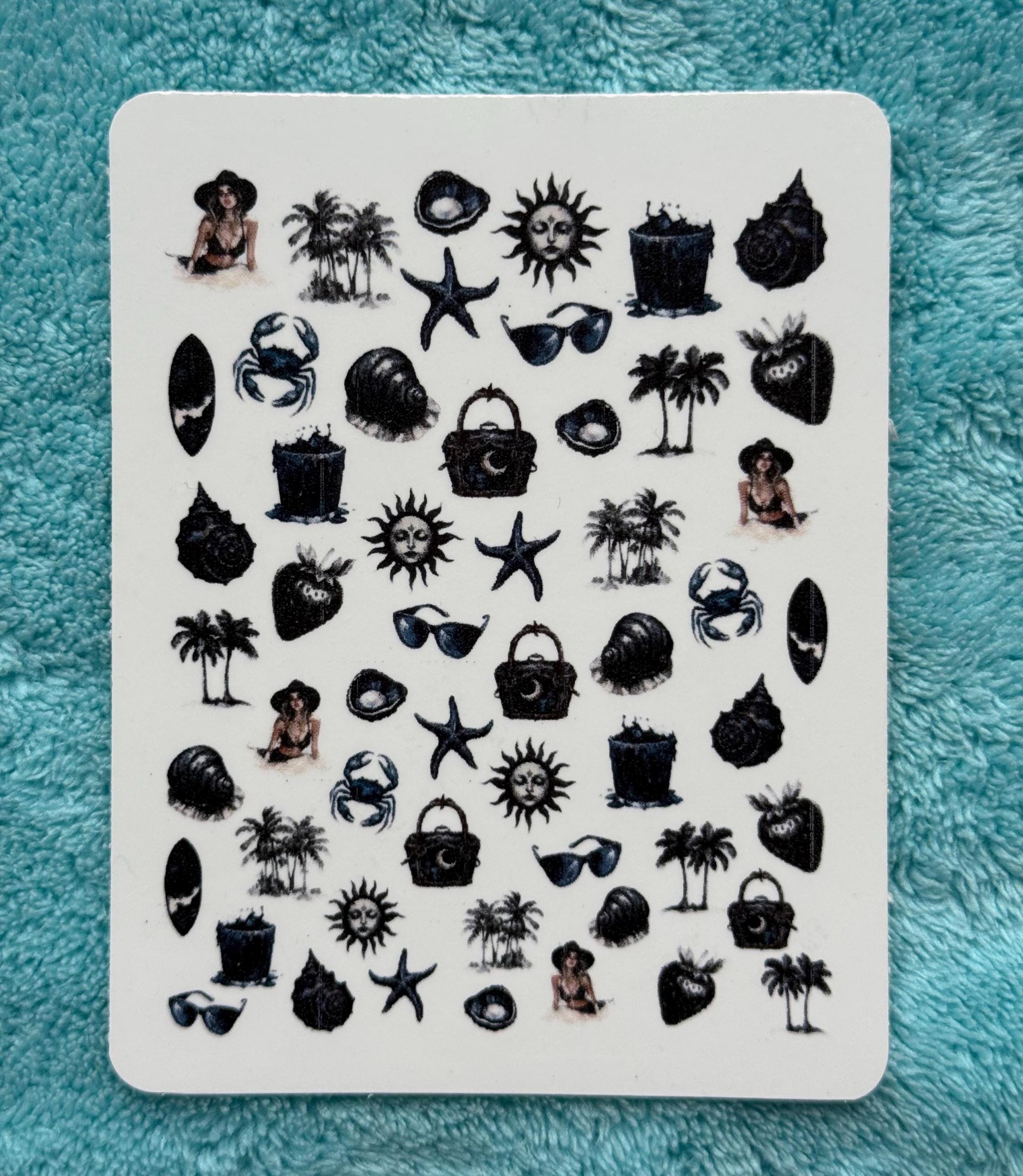 Gothic summer nail art waterslide stickers for nails, nail stickers starfish, palm tree, sun