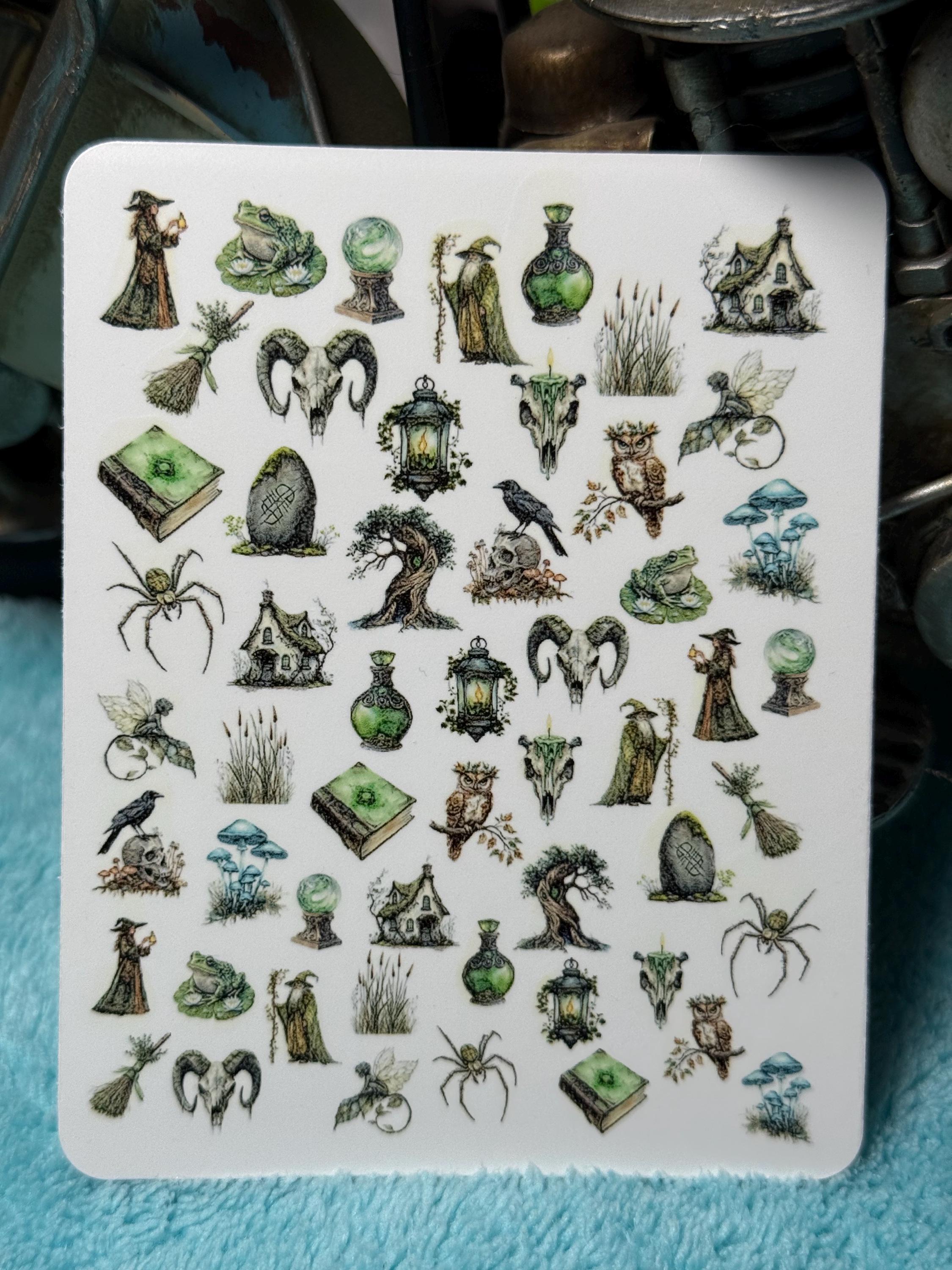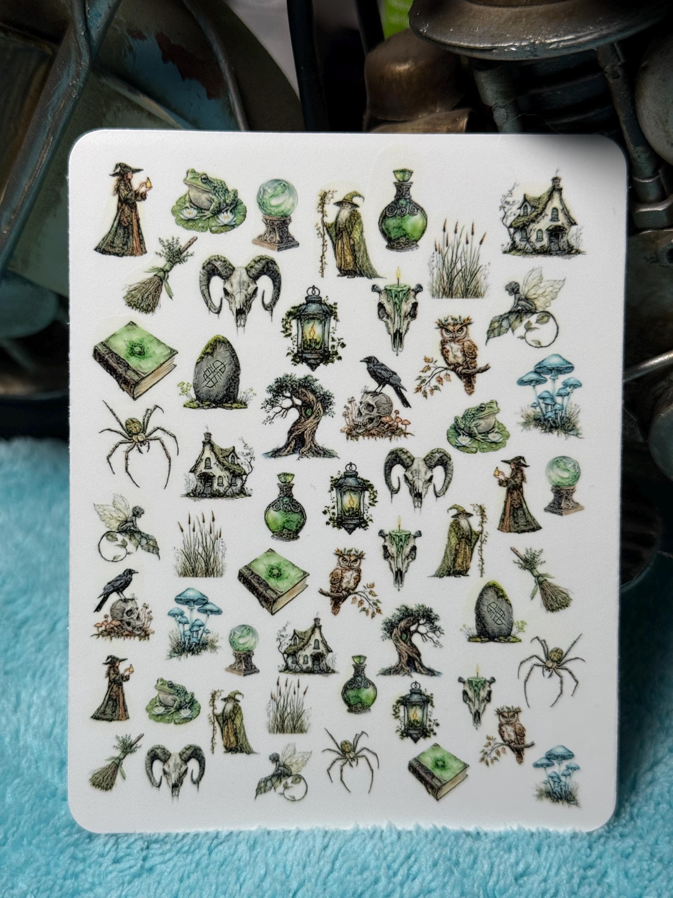 Witchcraft Nail Art Water Slide Stickers for Nails, Nail Stickers Witch, Witchcraft, Mushroom, Spider, Raven, Green