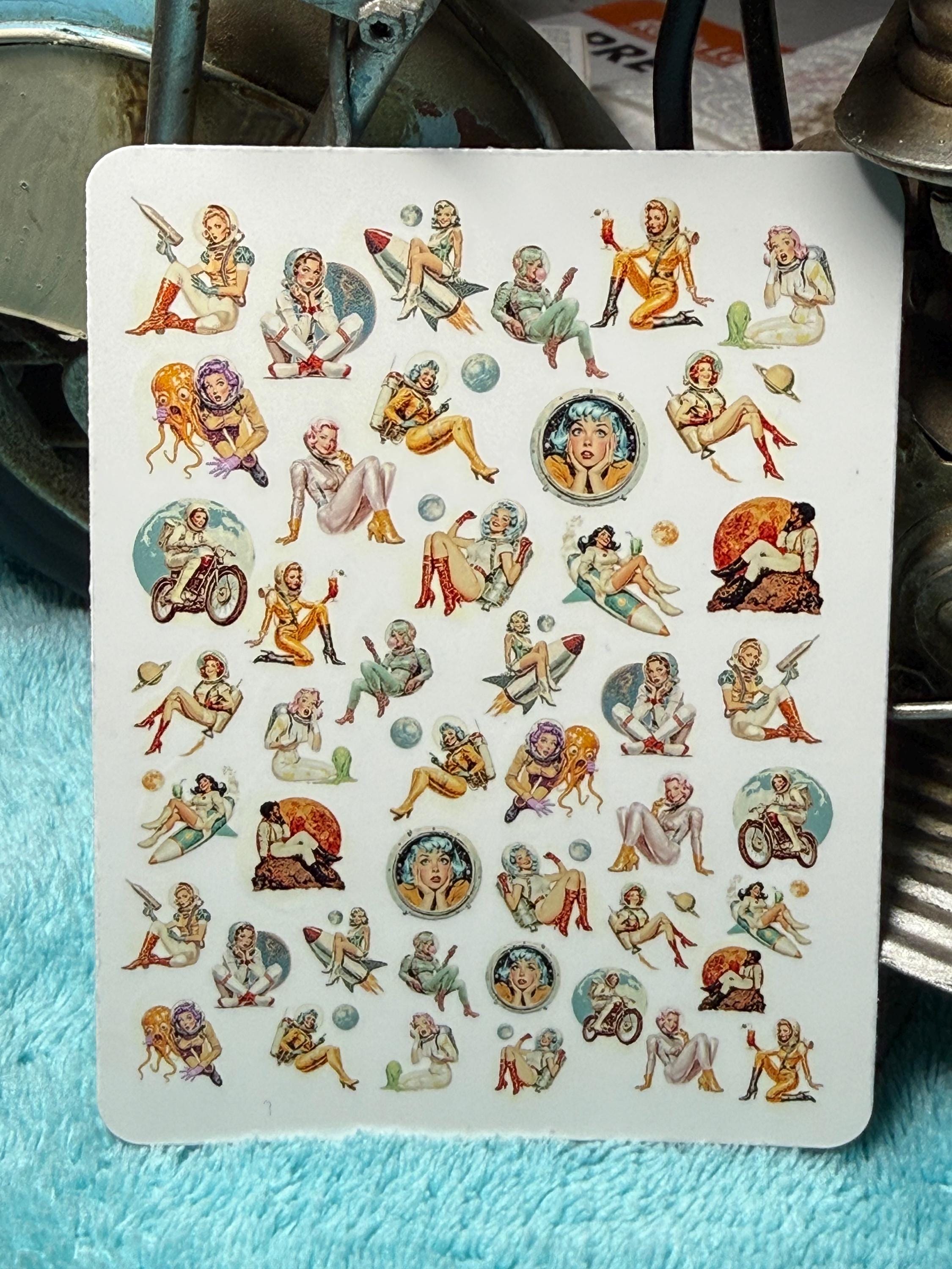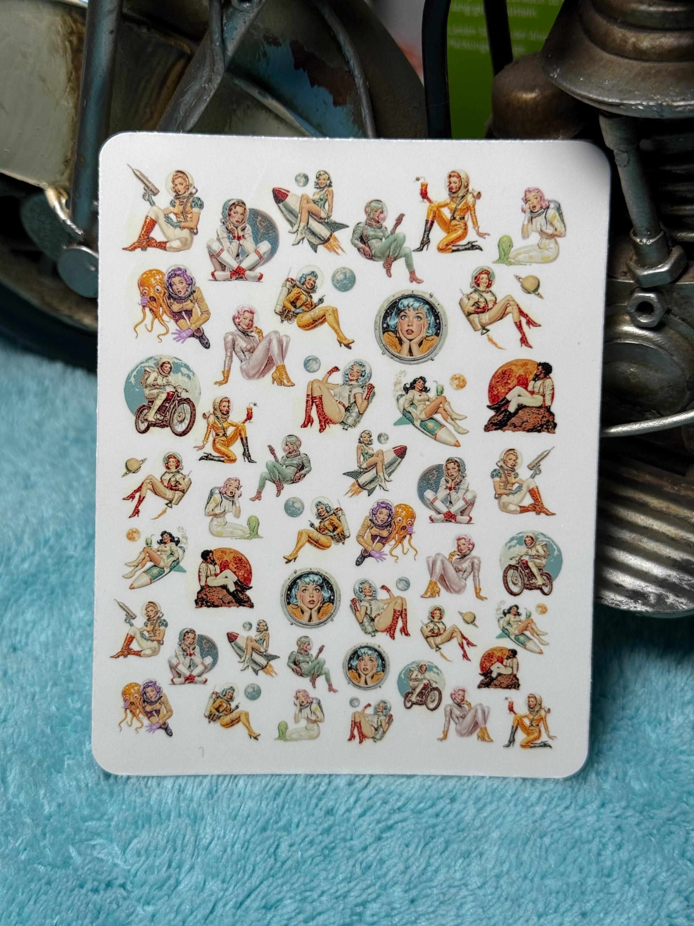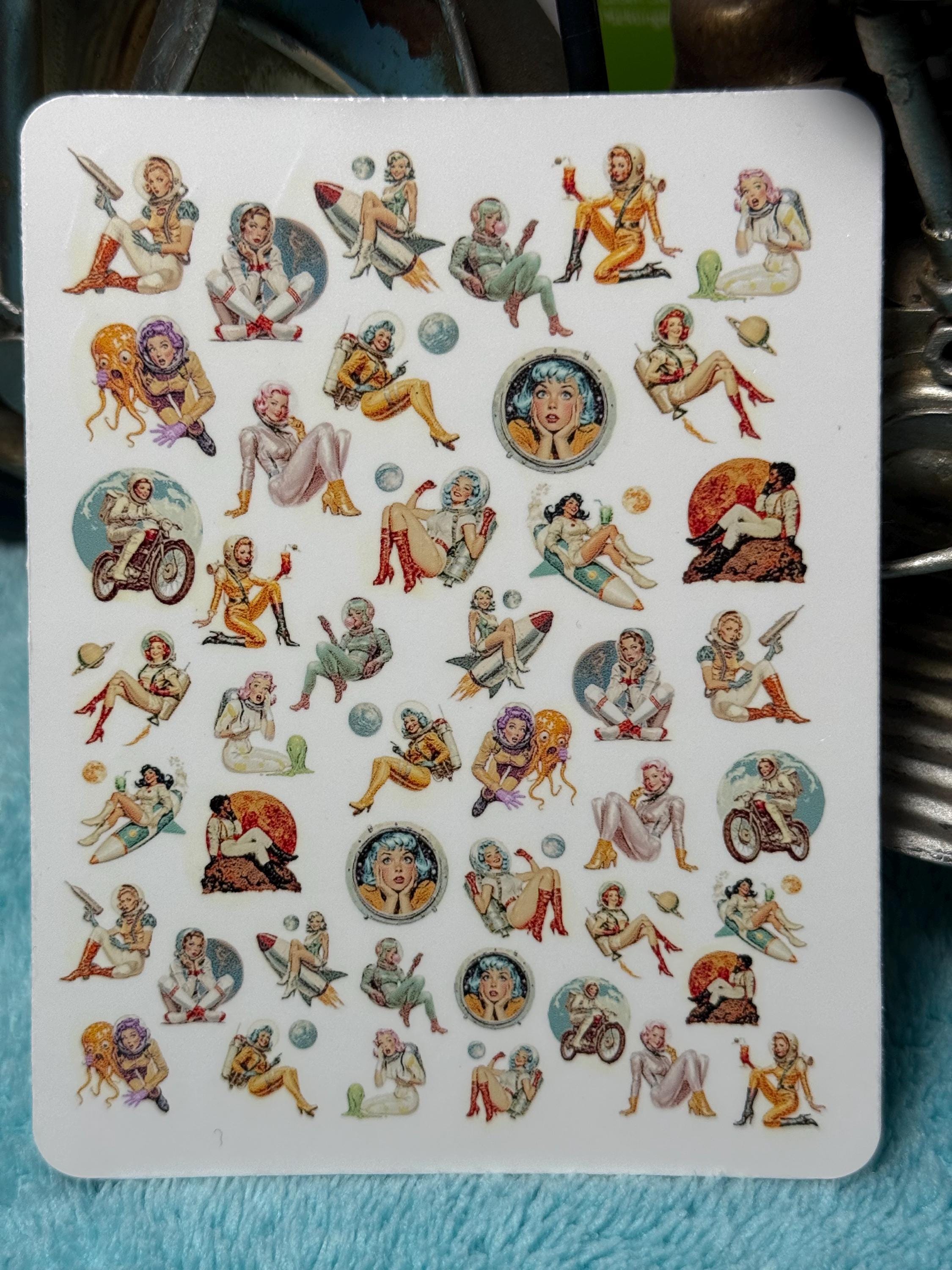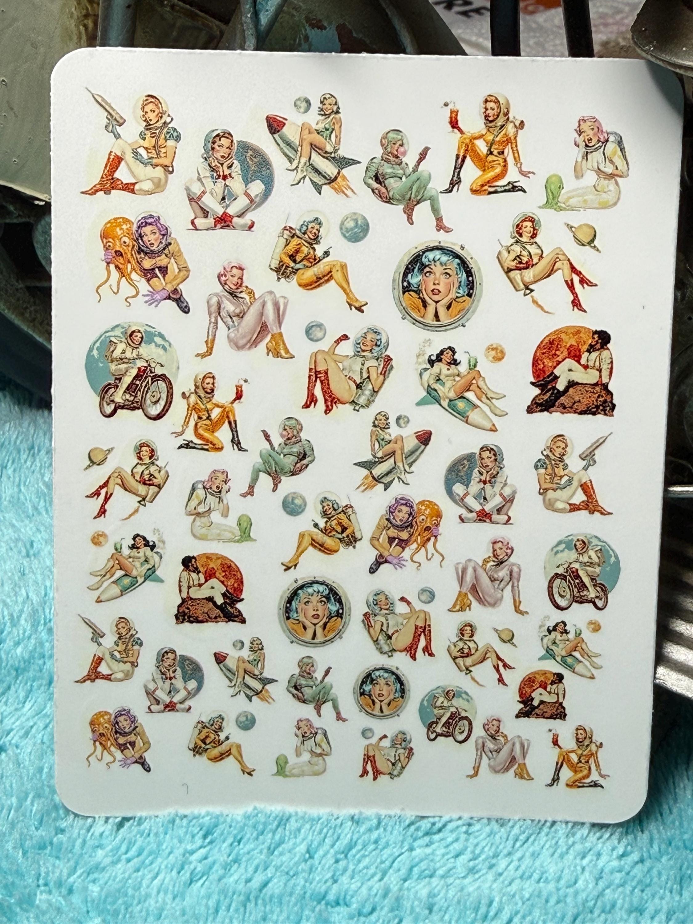 Vintage space girl nail art water slide stickers for nails, retro sci-fi space astronaut pin-up nail stickers