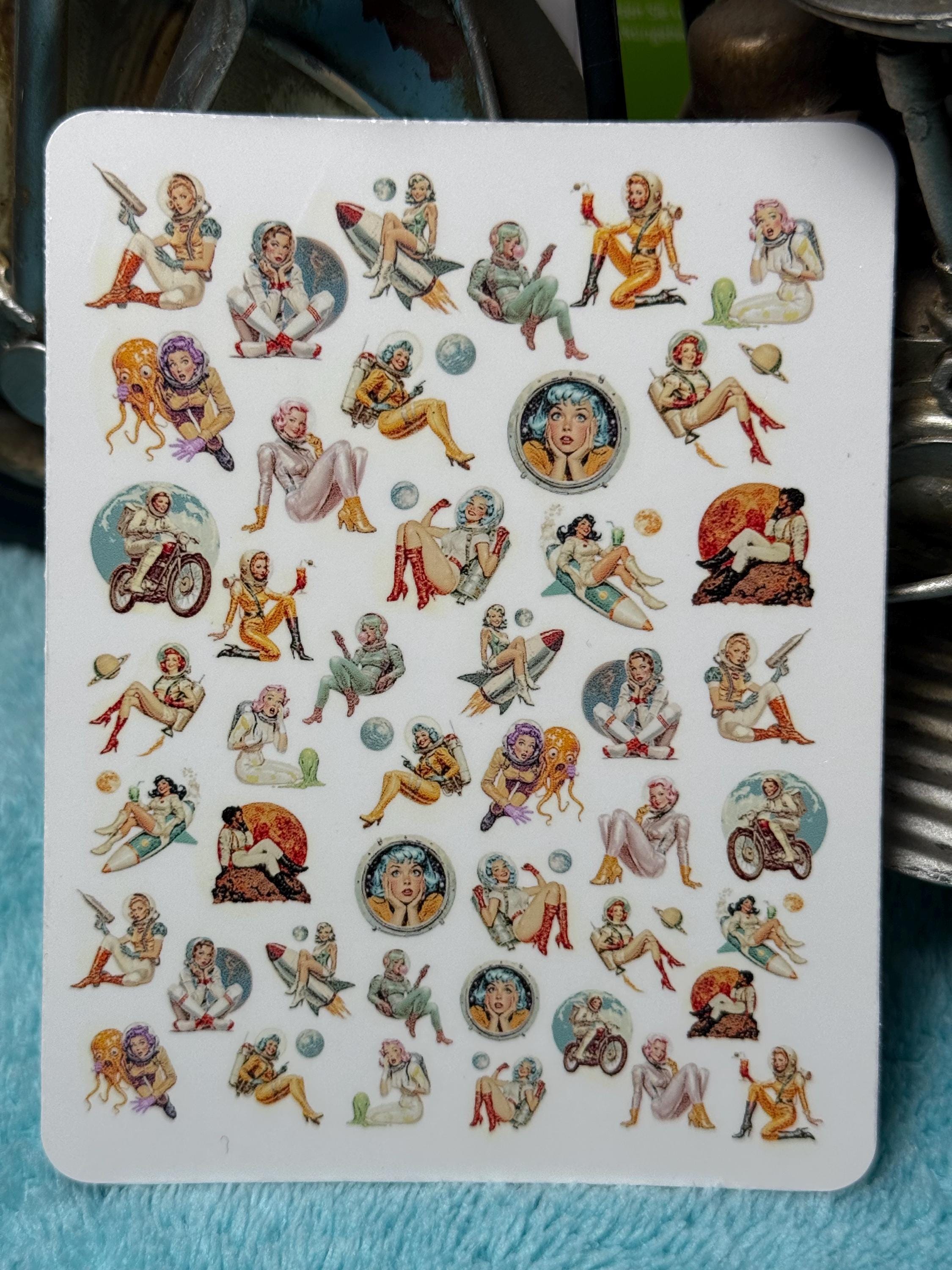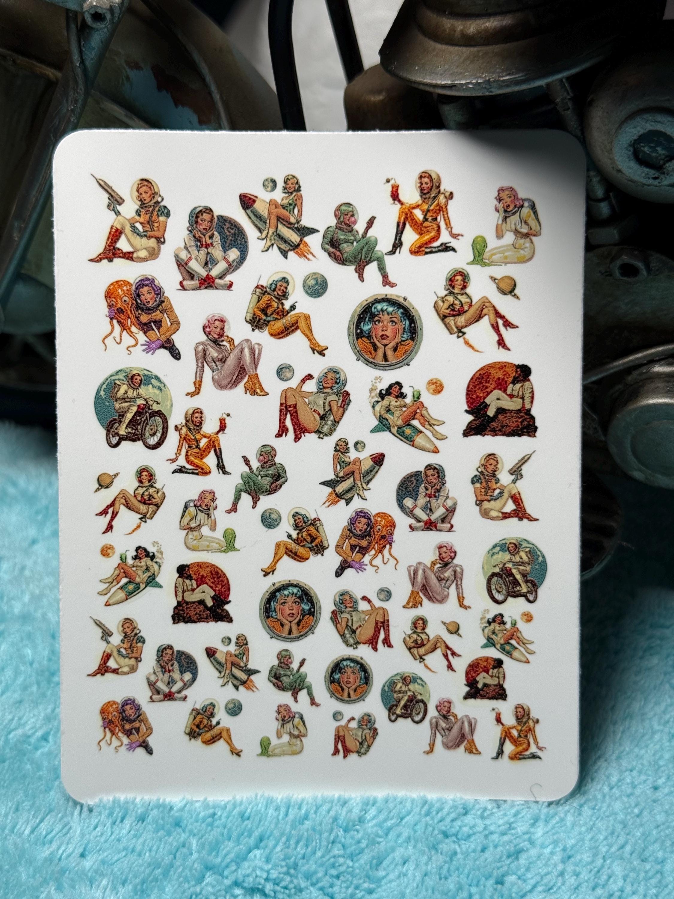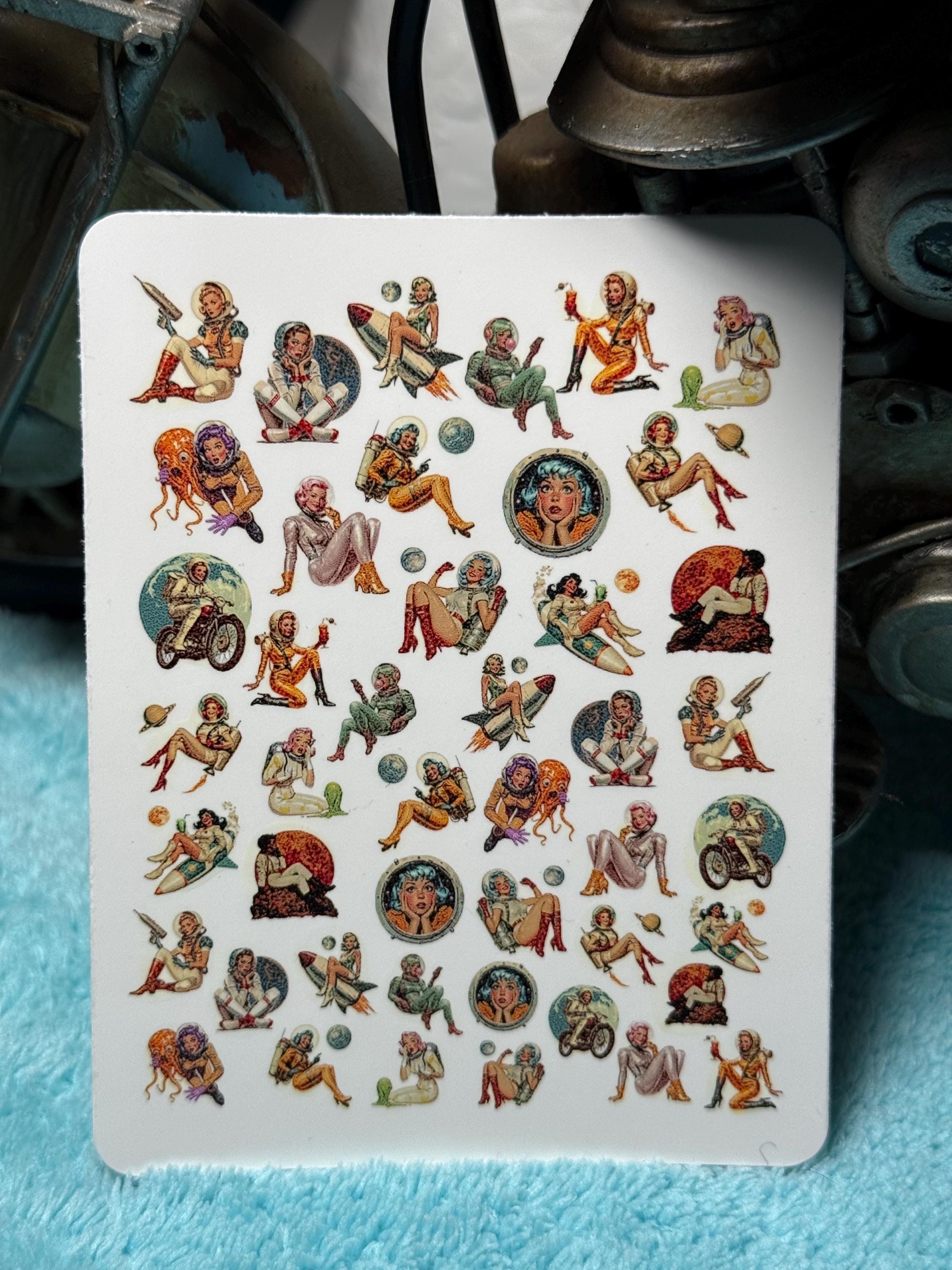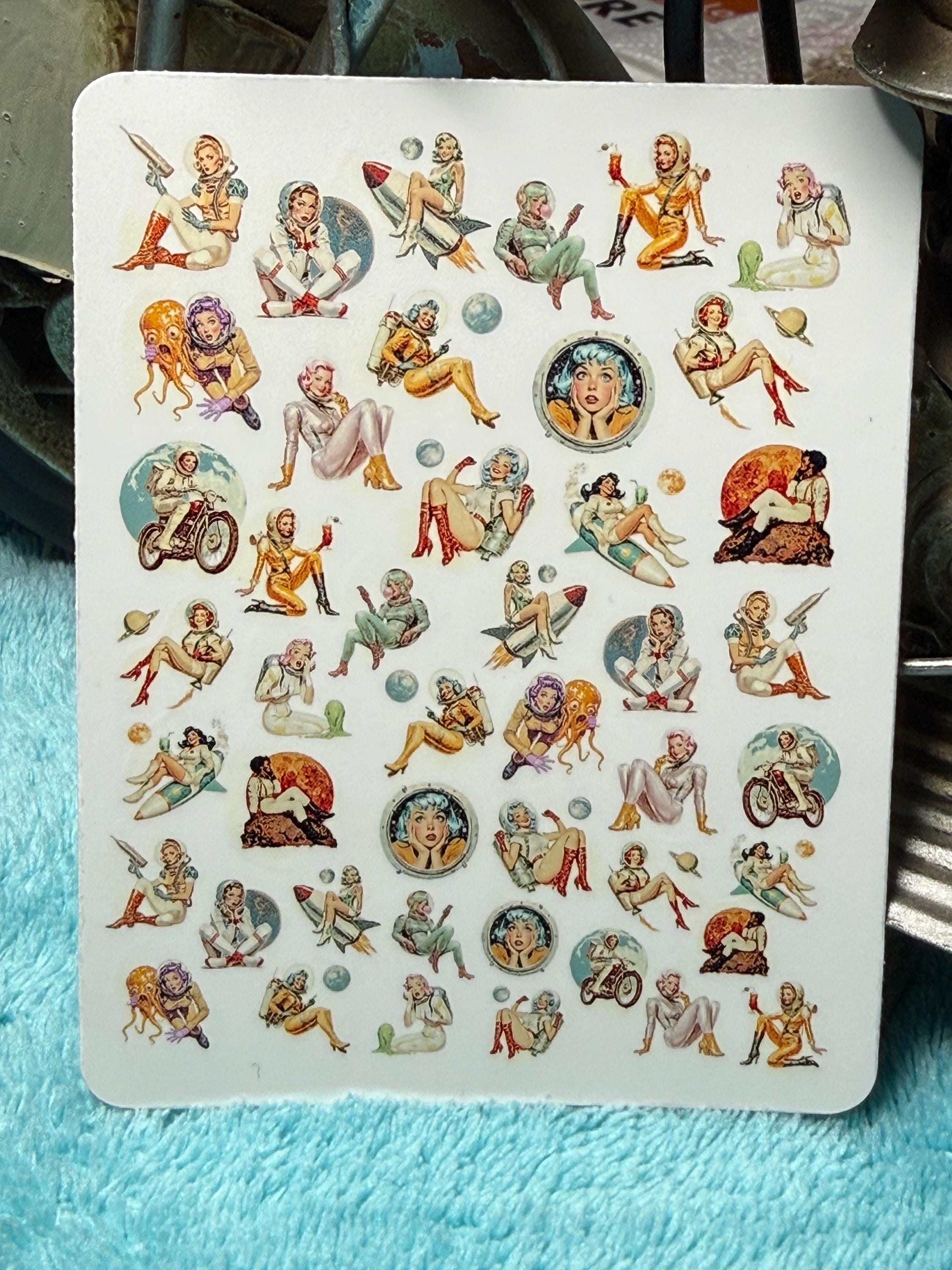 Vintage space girl nail art water slide stickers for nails, retro sci-fi space astronaut pin-up nail stickers
