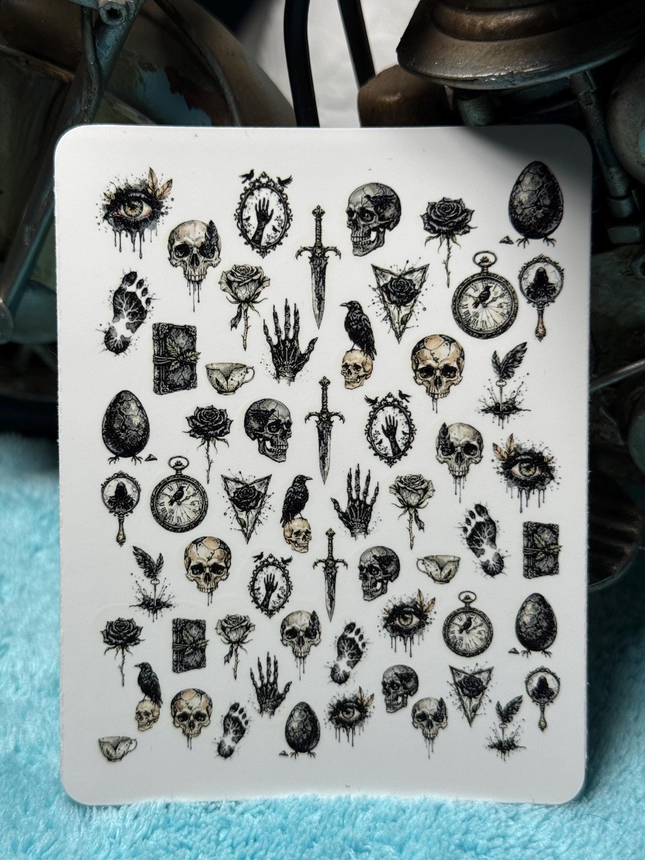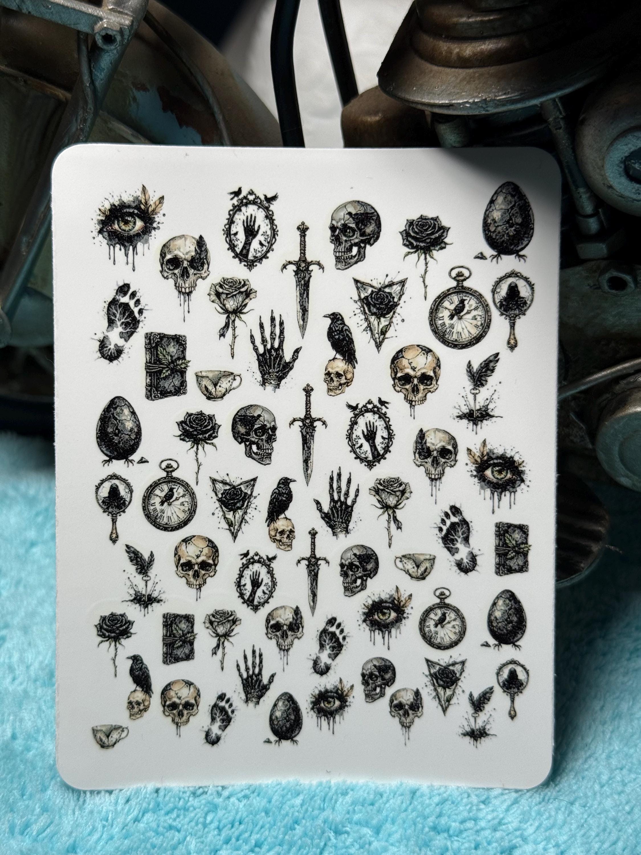 Dark Gothic Nail Art Water Slide Stickers for Nails, Skull, Rose, Feather Nail Stickers