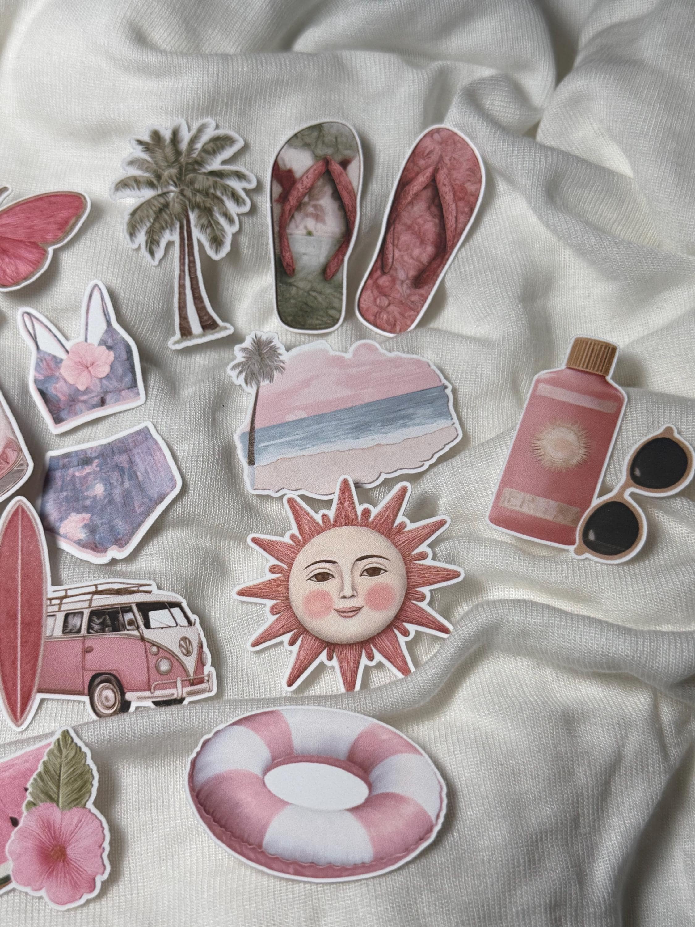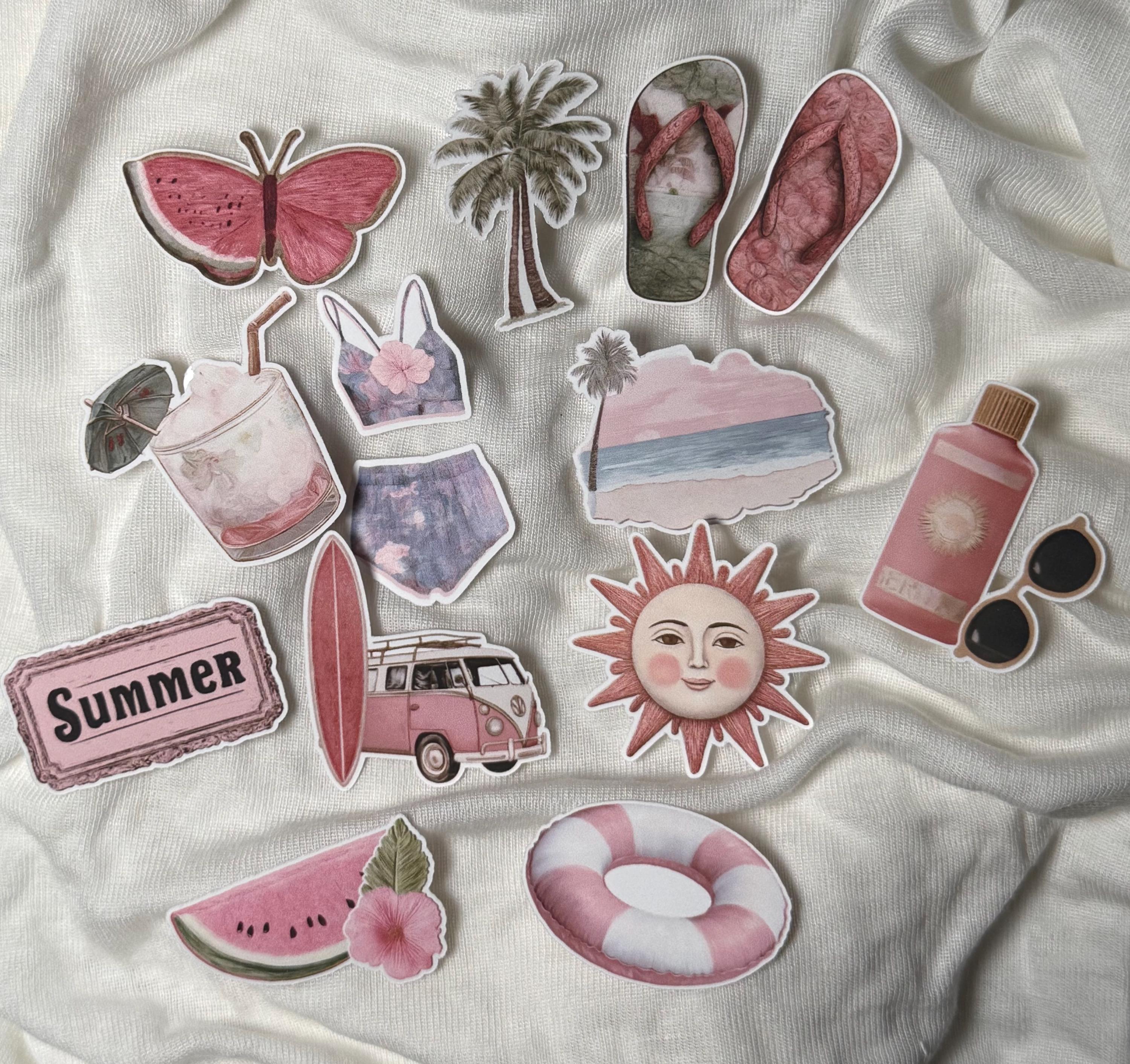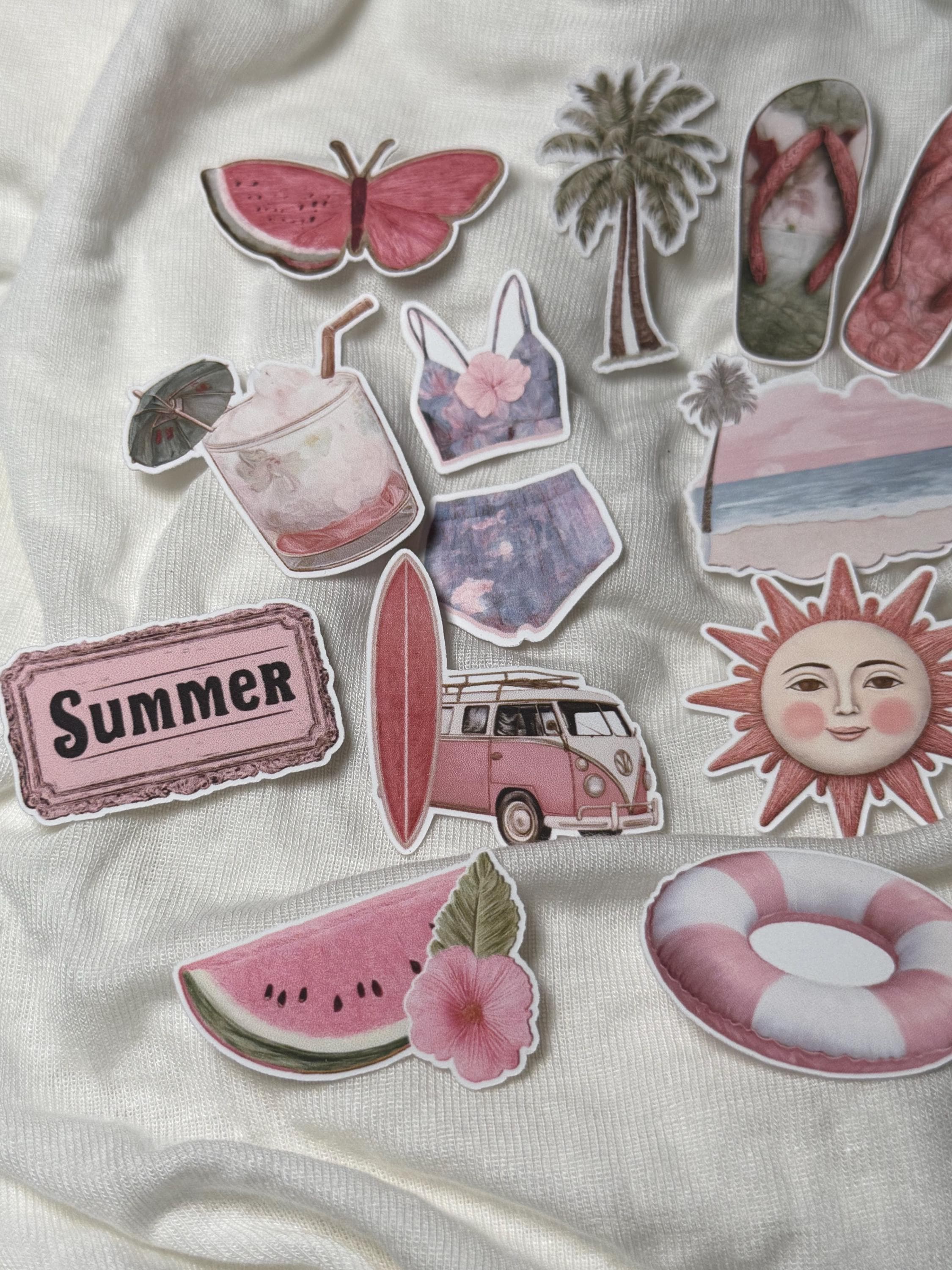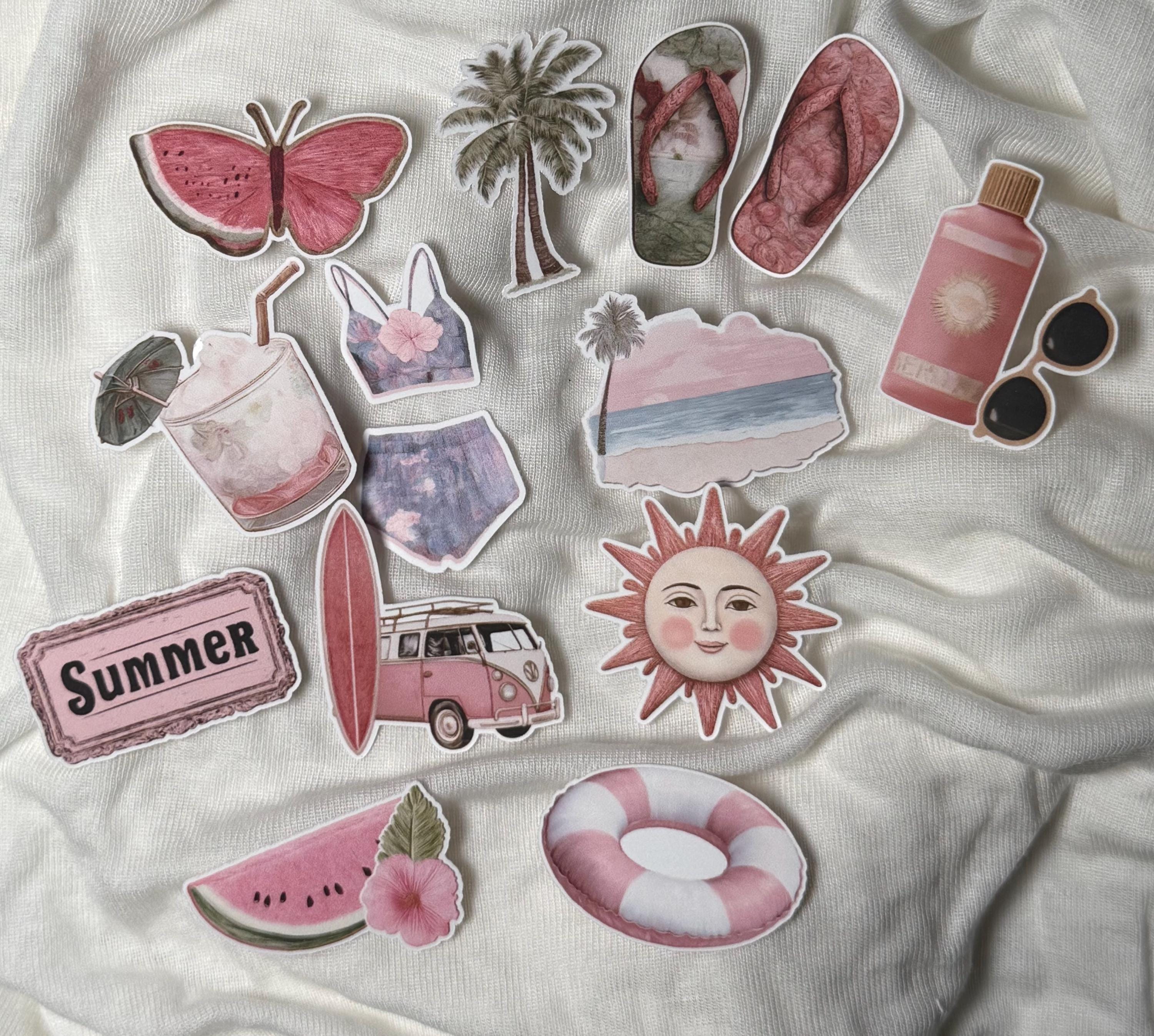 Sticker Set of 2 Mini - Retro Beach Vacation Stickers - Vinyl Stickers - Dusty Rose - Hibiscus - Bikini - Flip-Flops - Sun