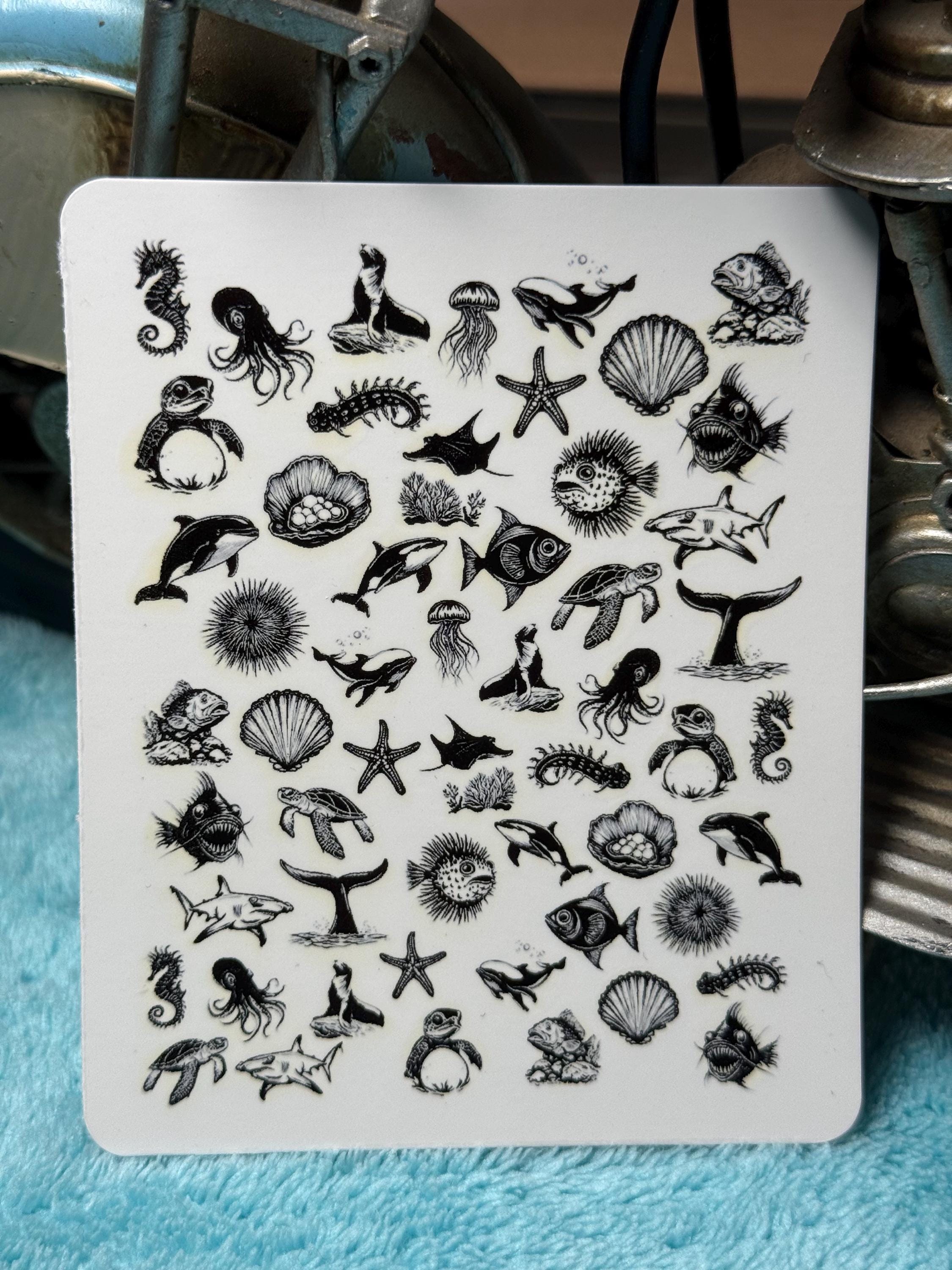 Sea creature water nail stickers, water slide stickers for nails, black nail art stickers: starfish, seahorse, dolphin