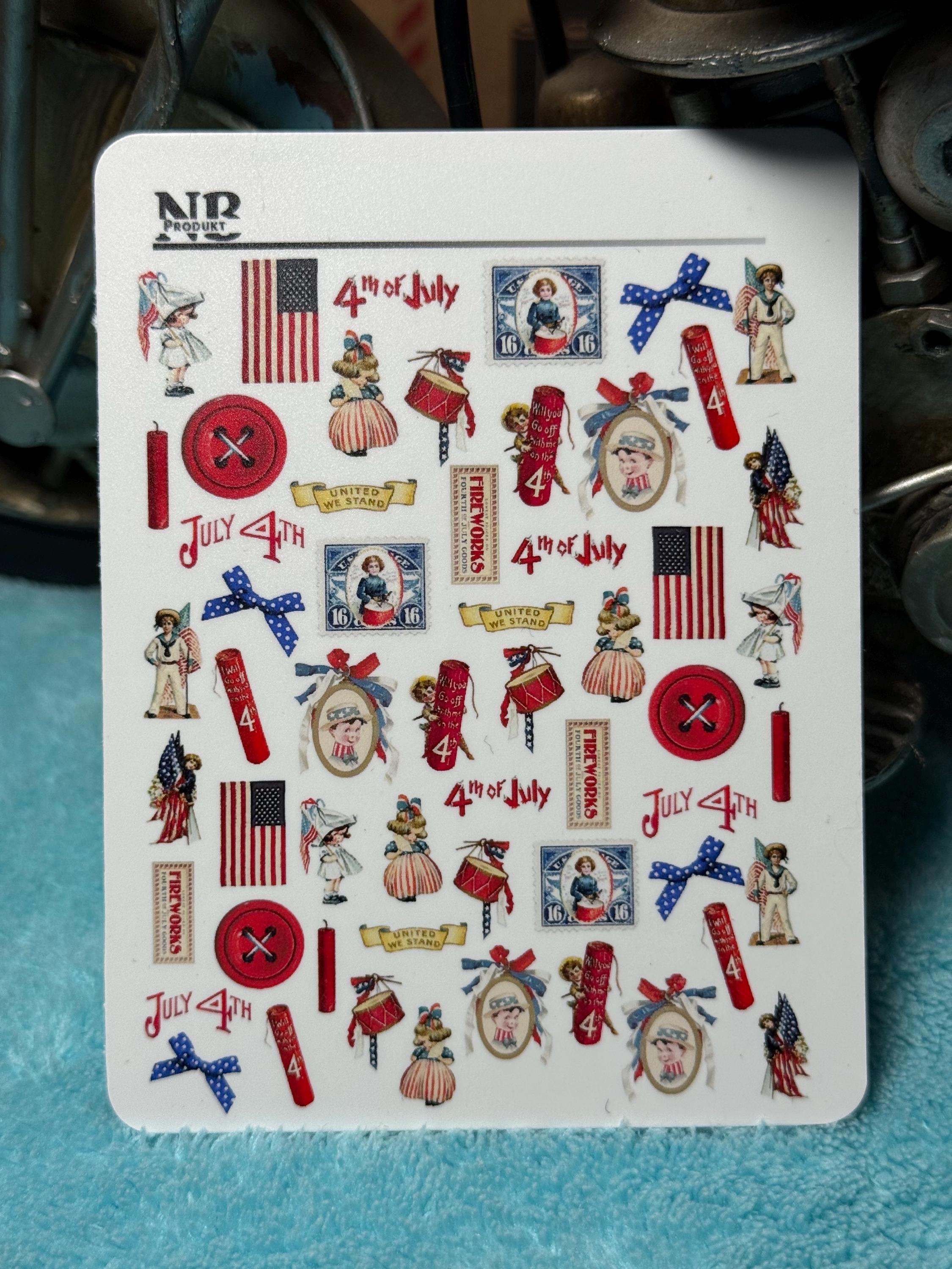 Vintage Fourth of July water nail stickers, water slide stickers for nails, nail stickers fireworks, drums, flag
