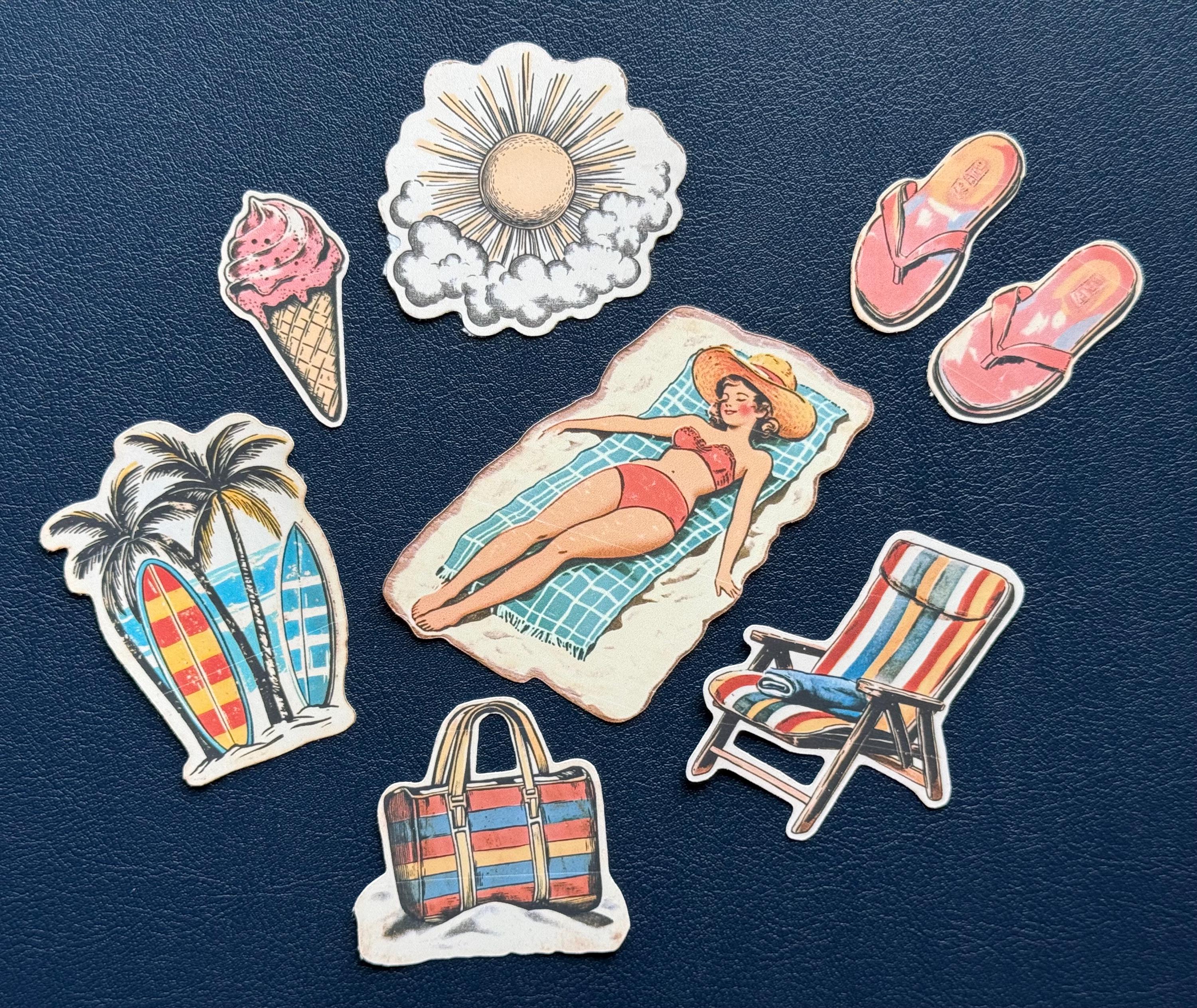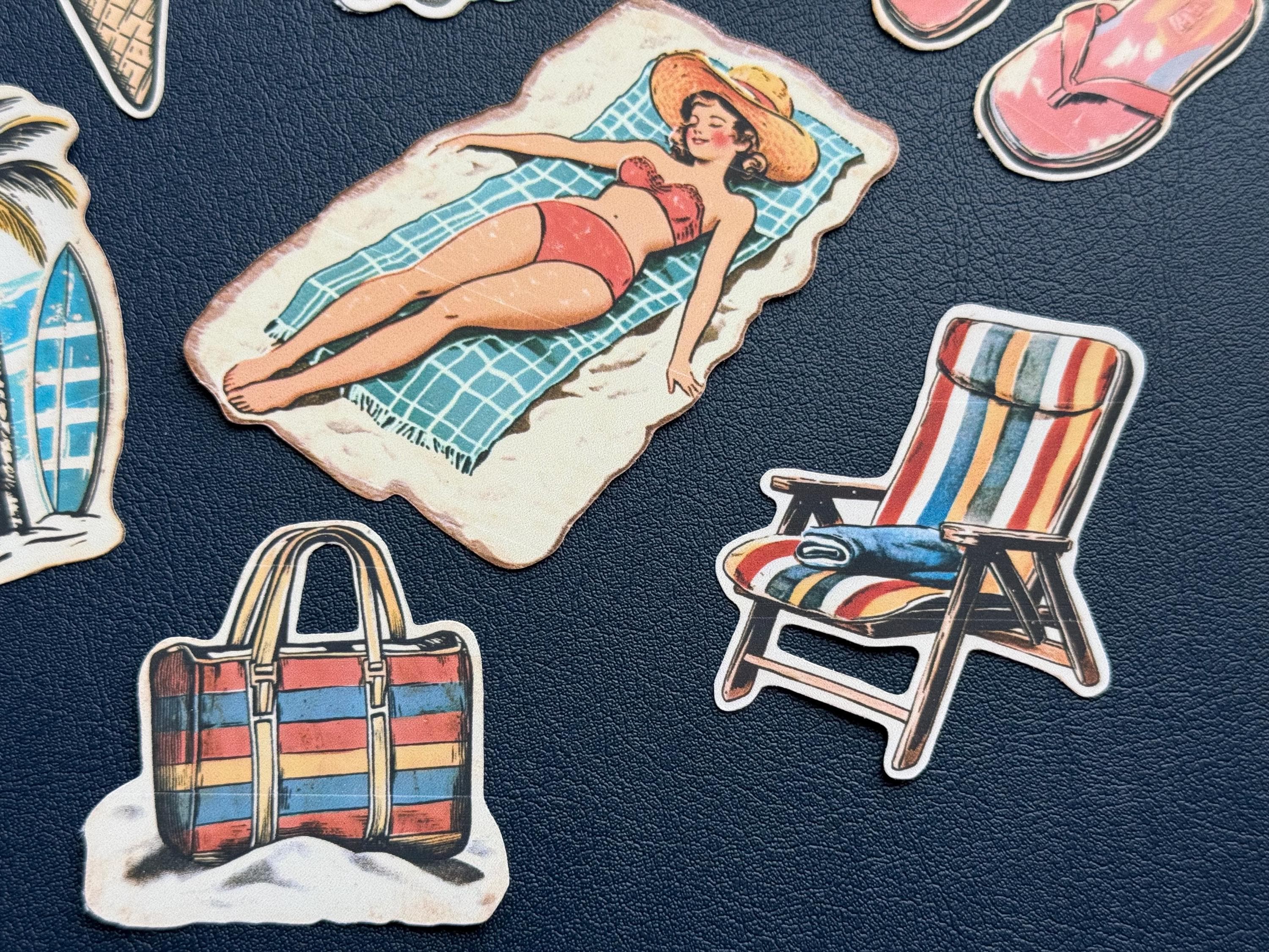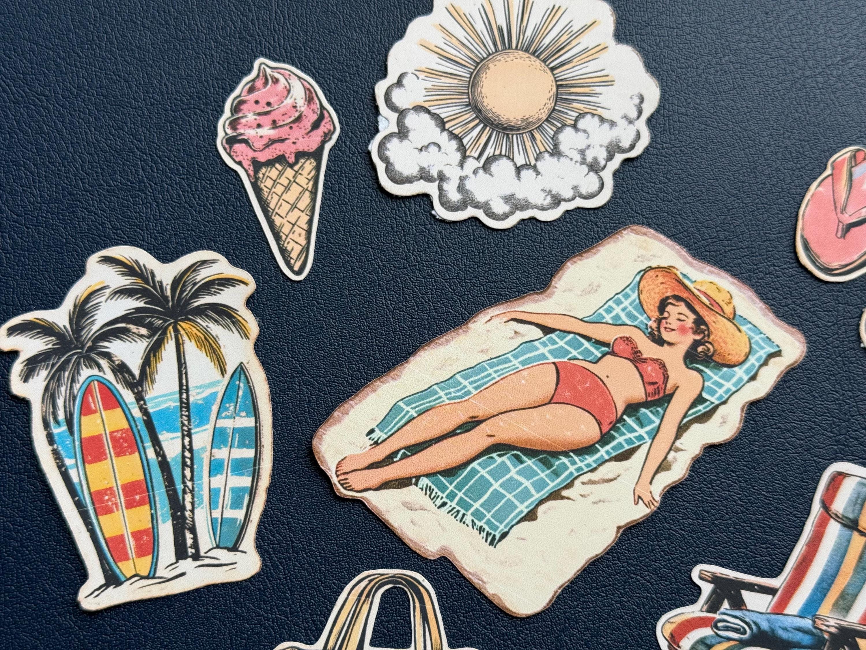 7 nostalgic vinyl stickers with a retro vacation theme.