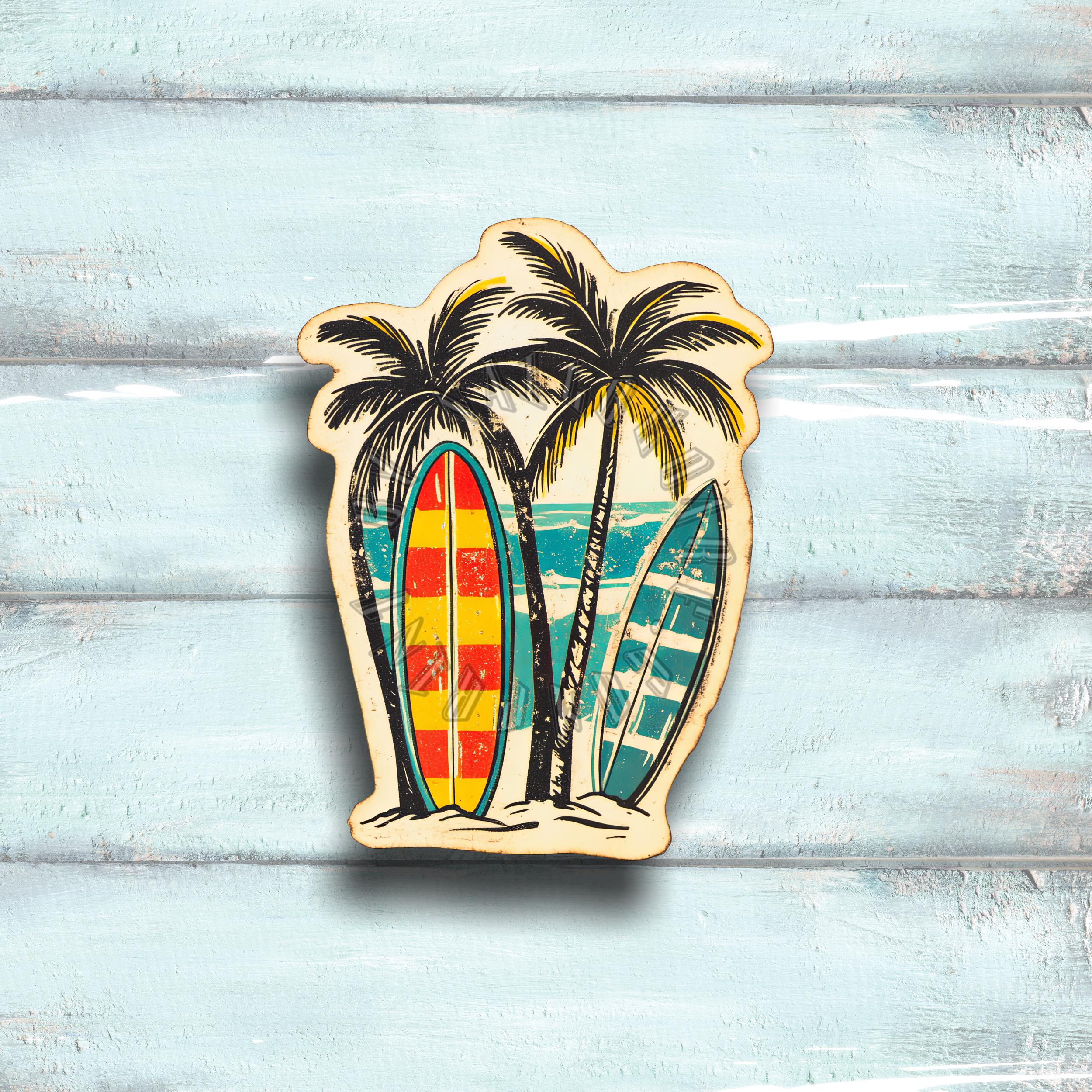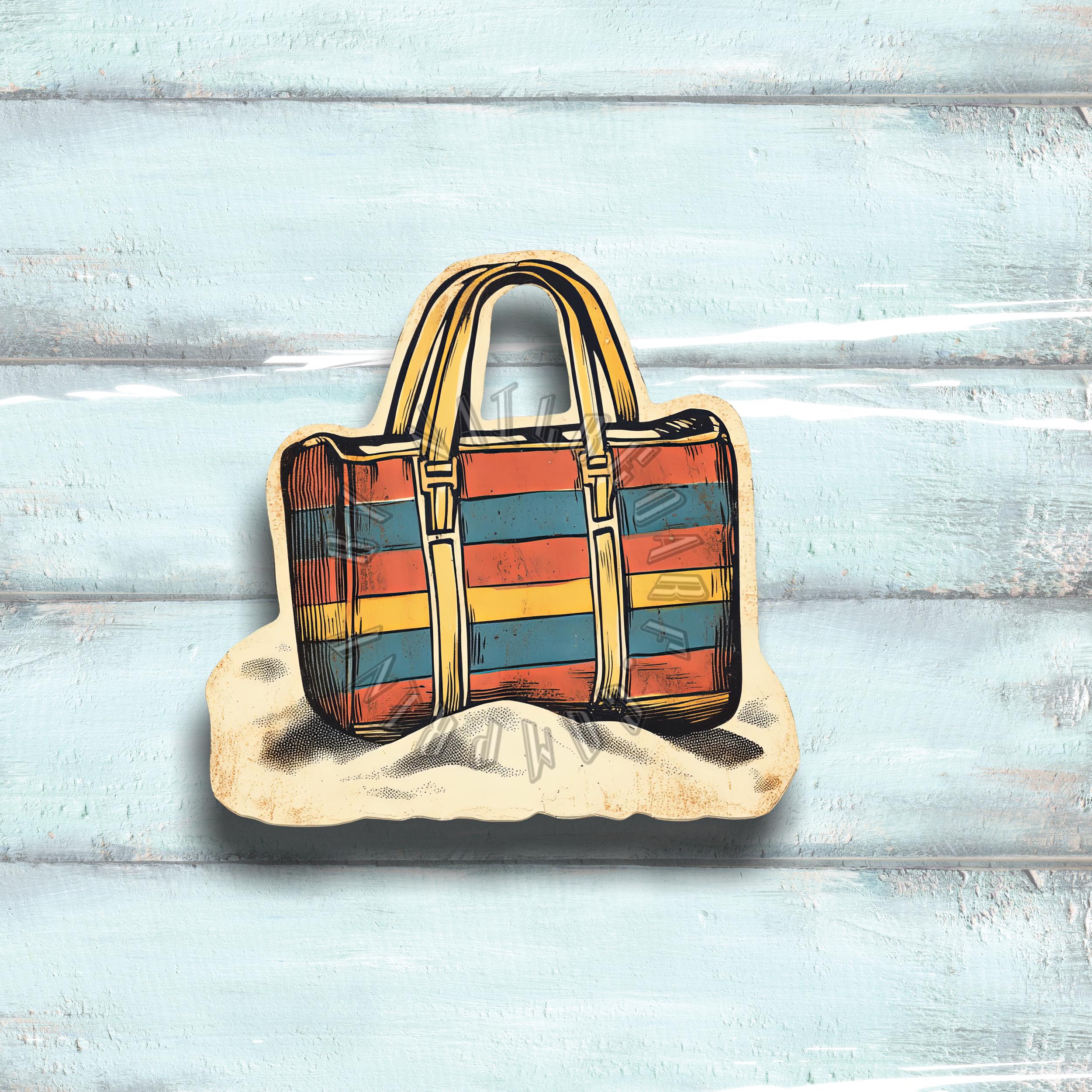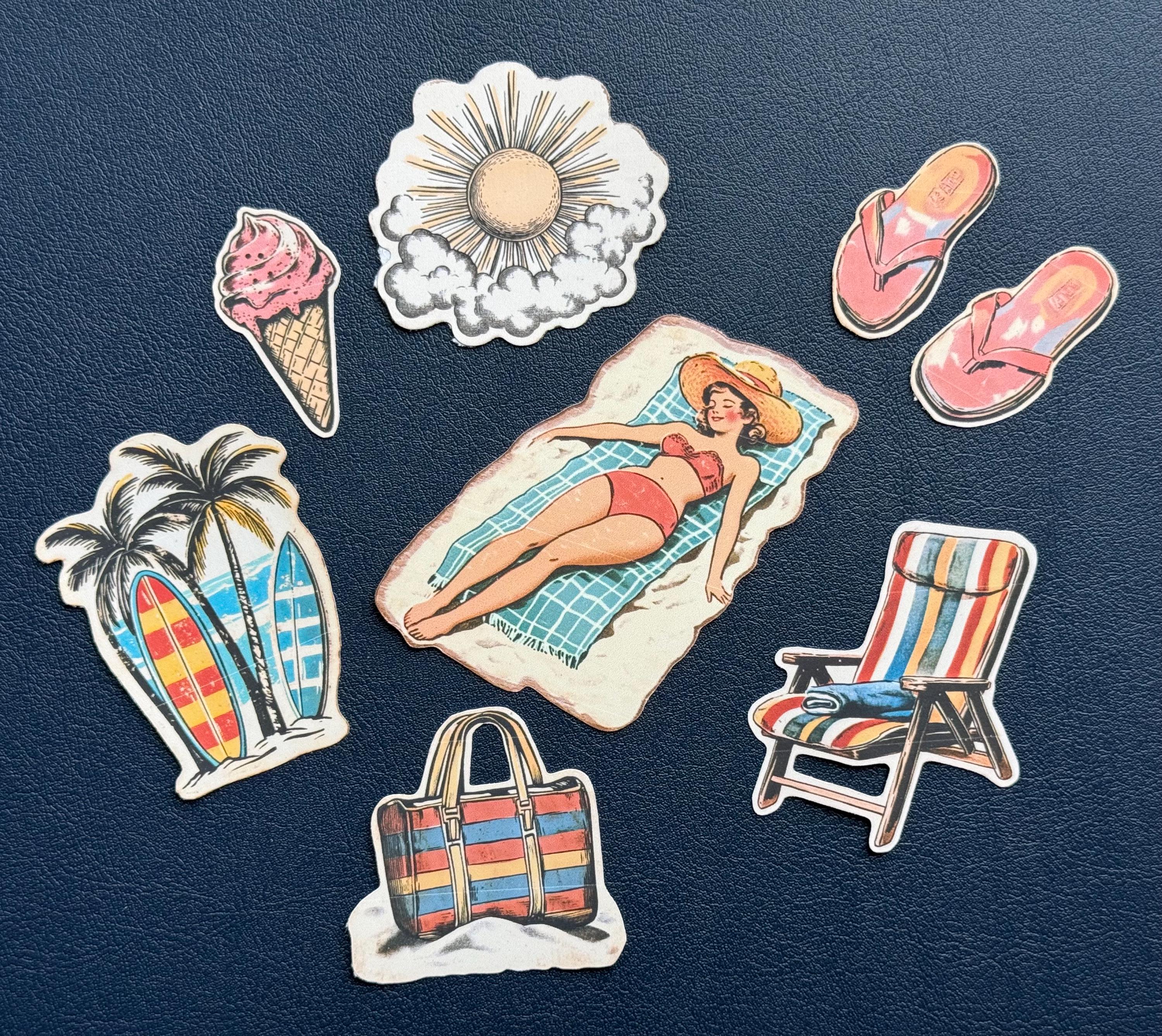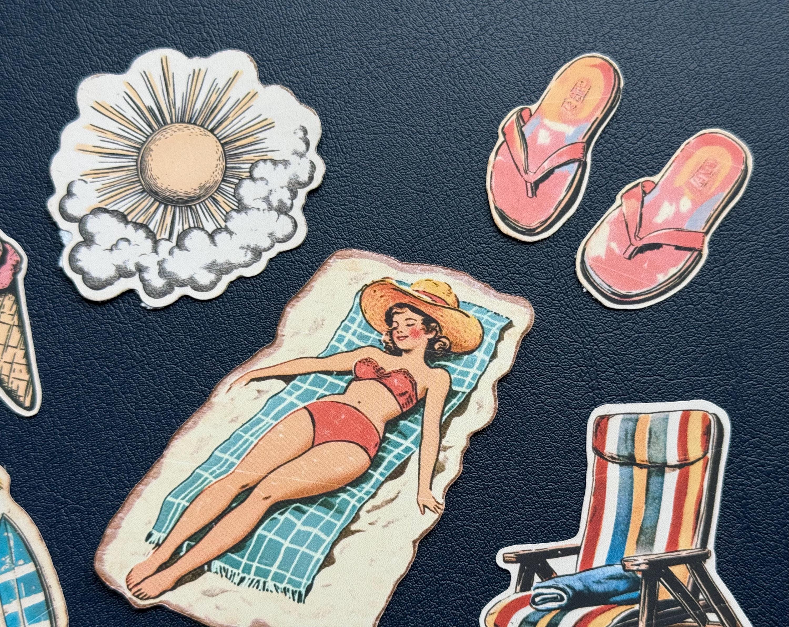 7 nostalgic vinyl stickers with a retro vacation theme.