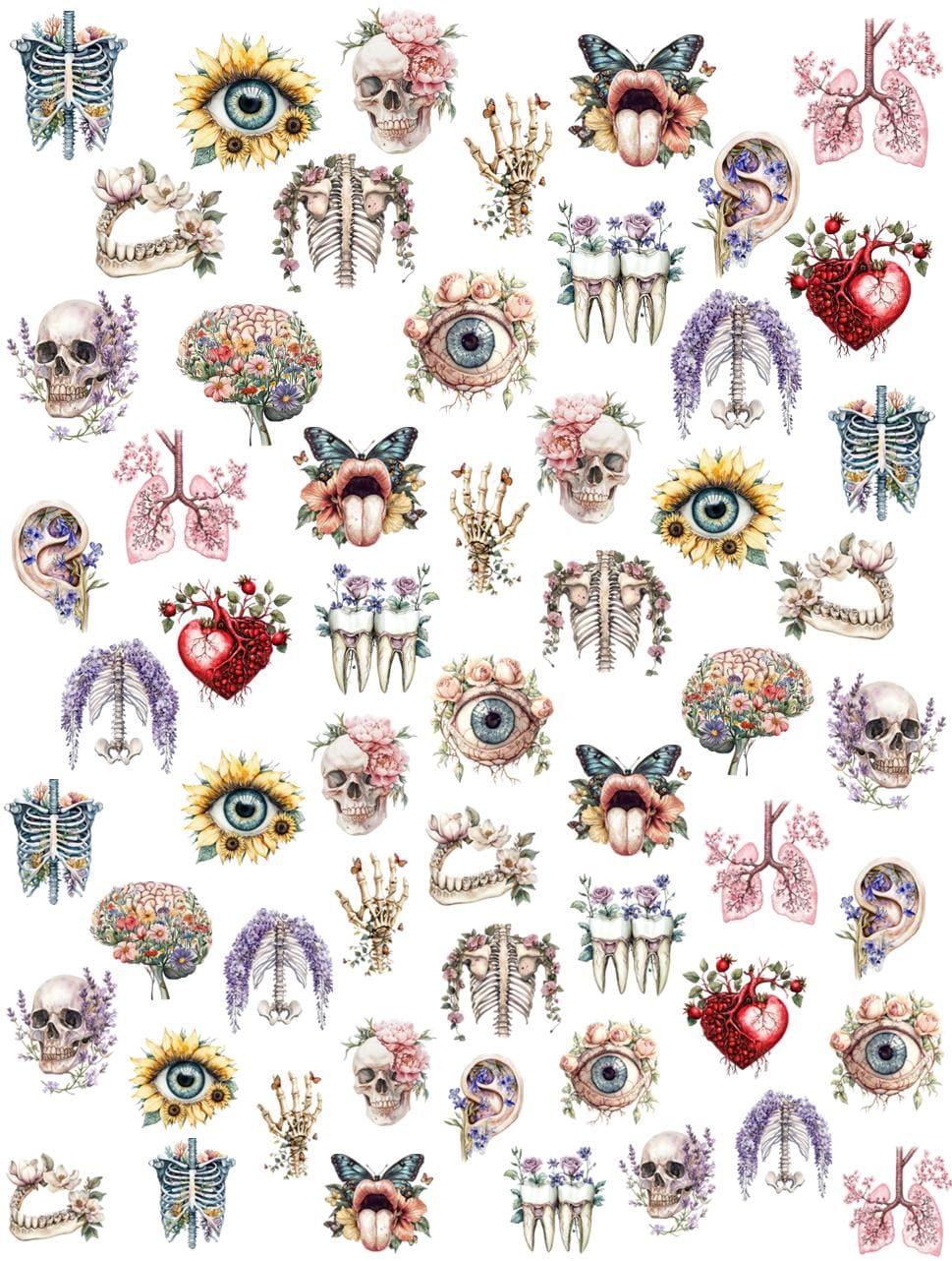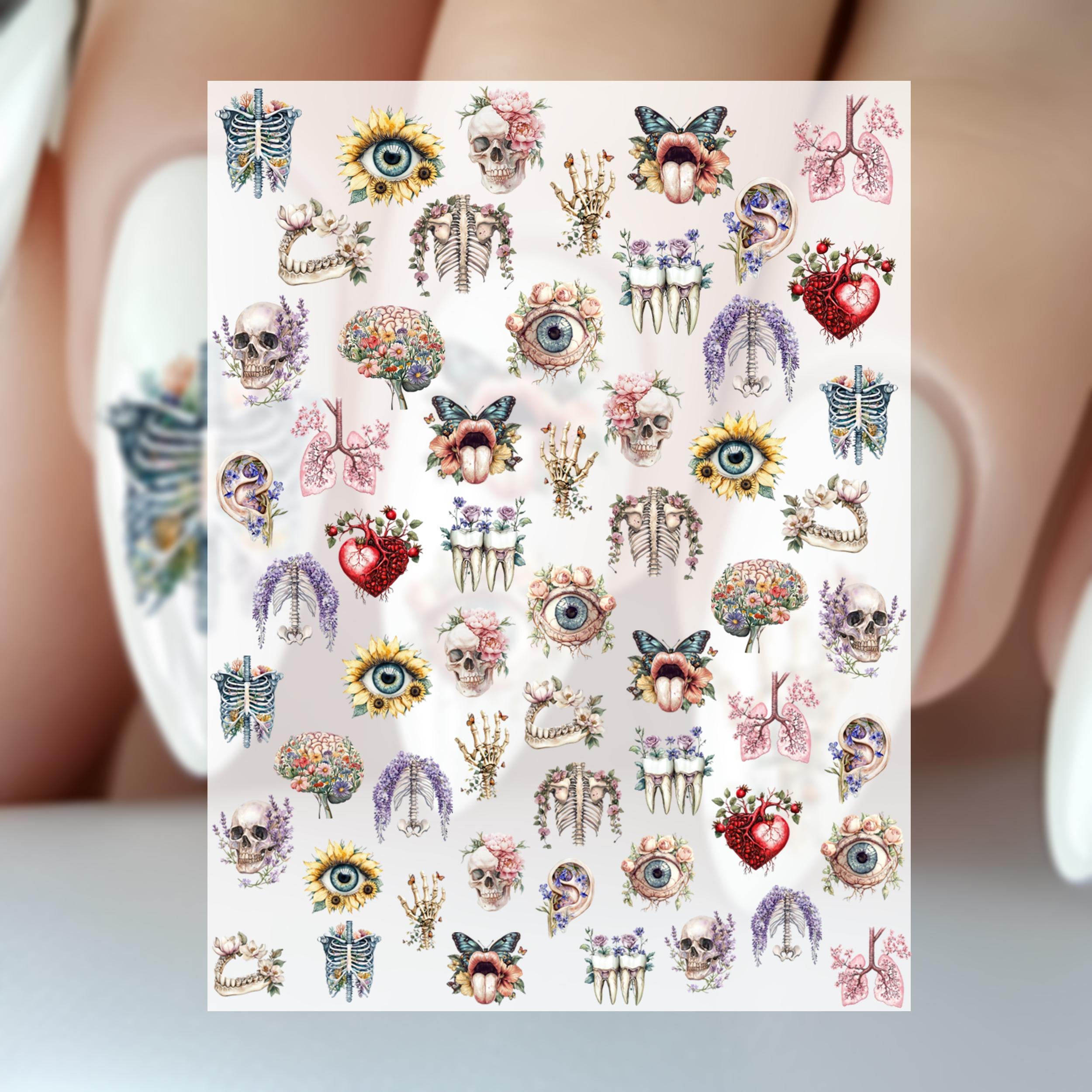 Floral Anatomy Water Slide Nail Stickers, Skull with Roses, Flowers, Vines, Leaves, Eye, Ear, Hand
