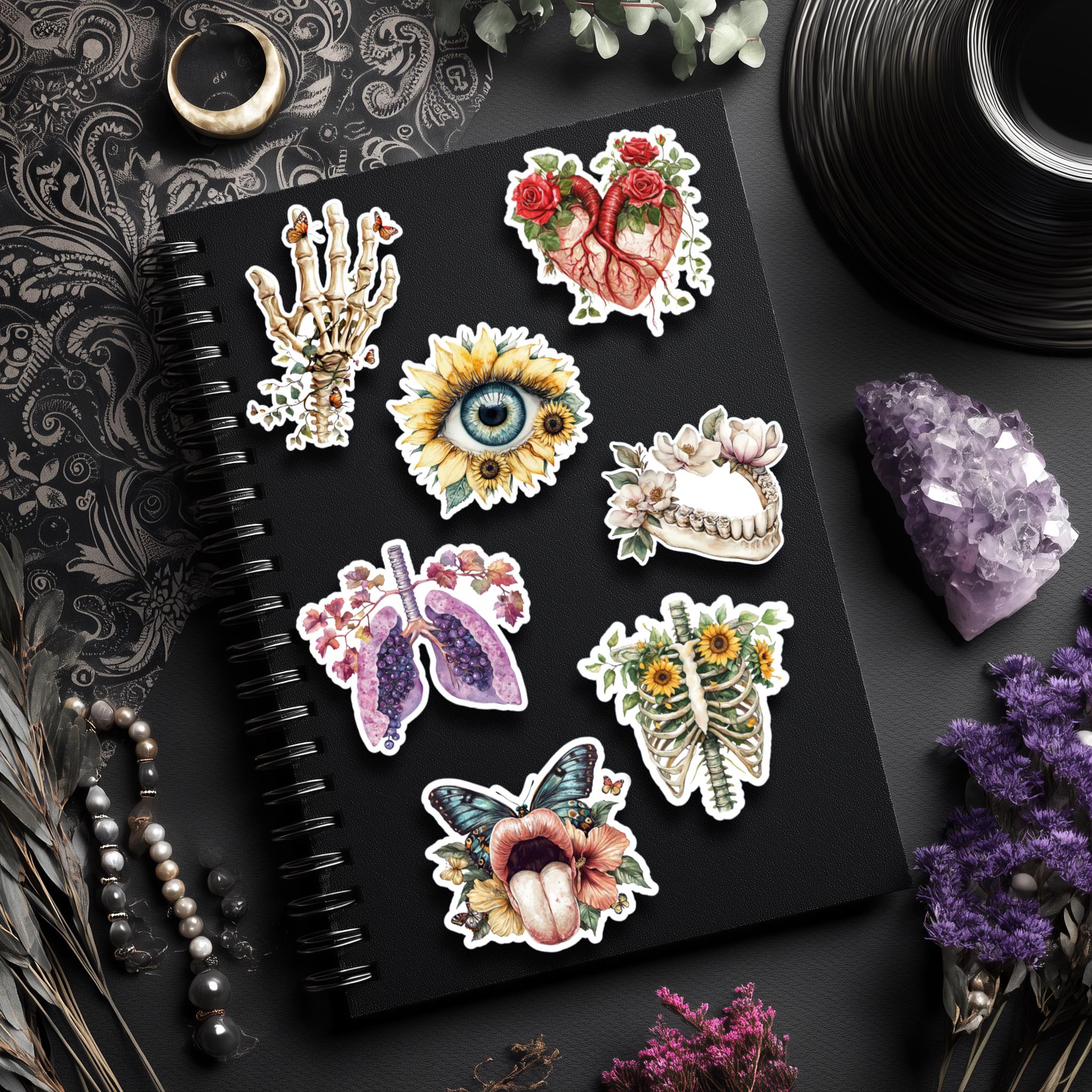 Anatomy Floral Stickers, Flower Heart, Flower Eye, Floral Skeleton Hand, Teeth, Lungs - Matte/Glossy Waterproof